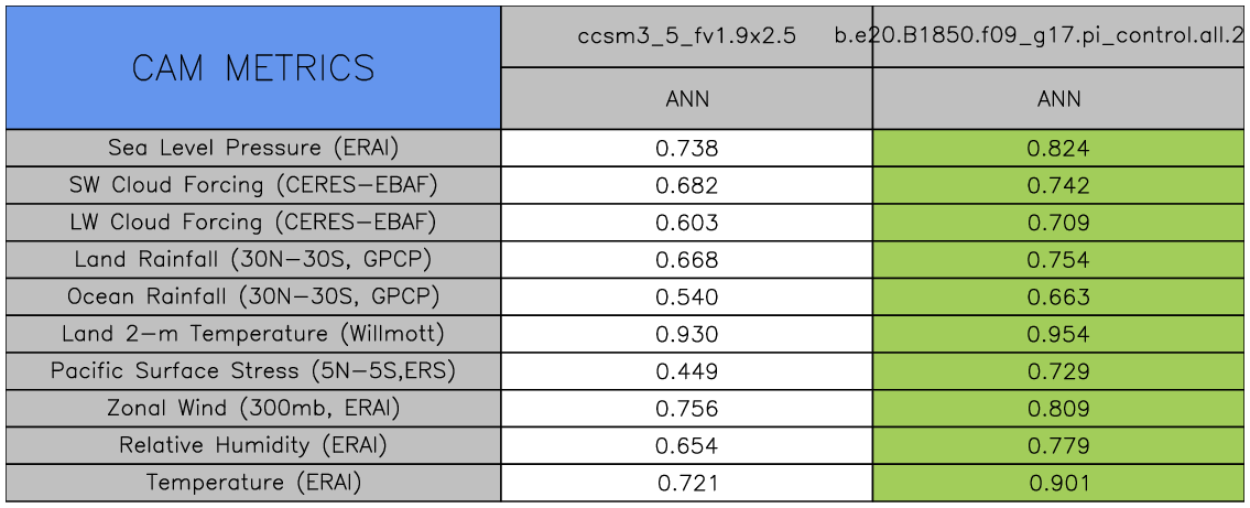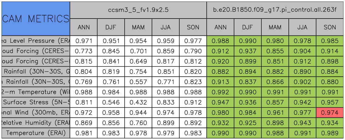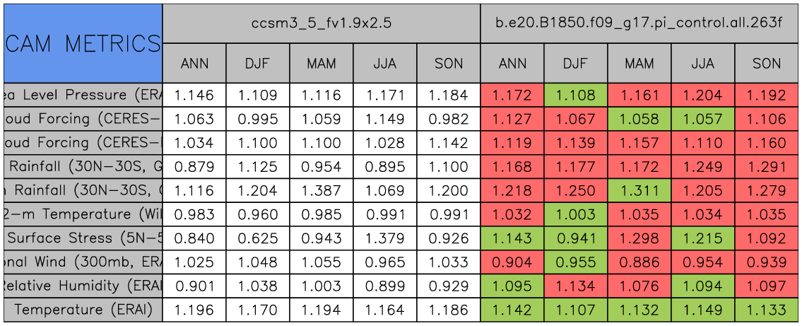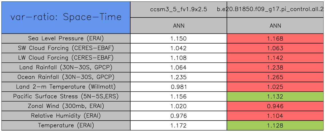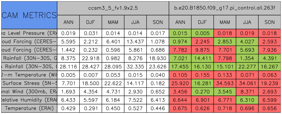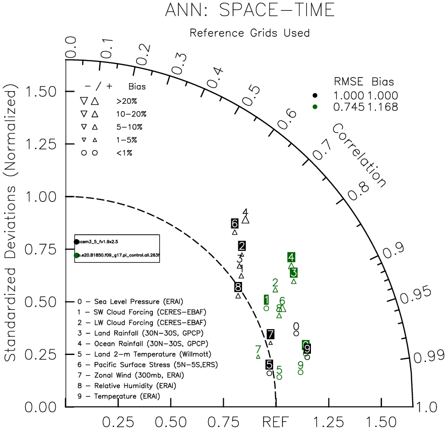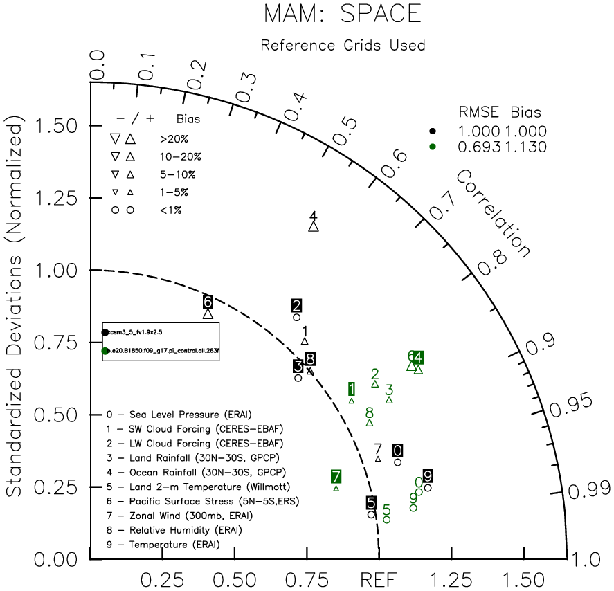 Taylor Diagrams were developed by Karl Taylor at PCMDI (paper|tech note) and aim to condense information about variance and RMSE characteristics of a particular model run when compared with observations in a single diagram. The tables summarize the individual metrics for each variable considered including: