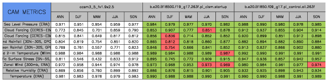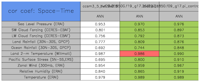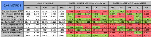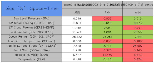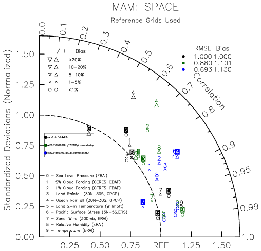 Taylor Diagrams were developed by Karl Taylor at PCMDI (paper|tech note) and aim to condense information about variance and RMSE characteristics of a particular model run when compared with observations in a single diagram. The tables summarize the individual metrics for each variable considered including: