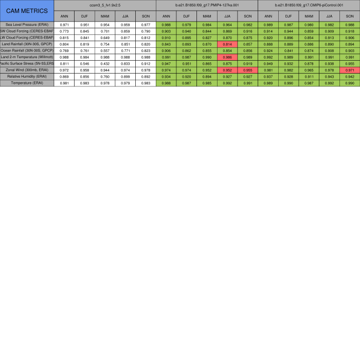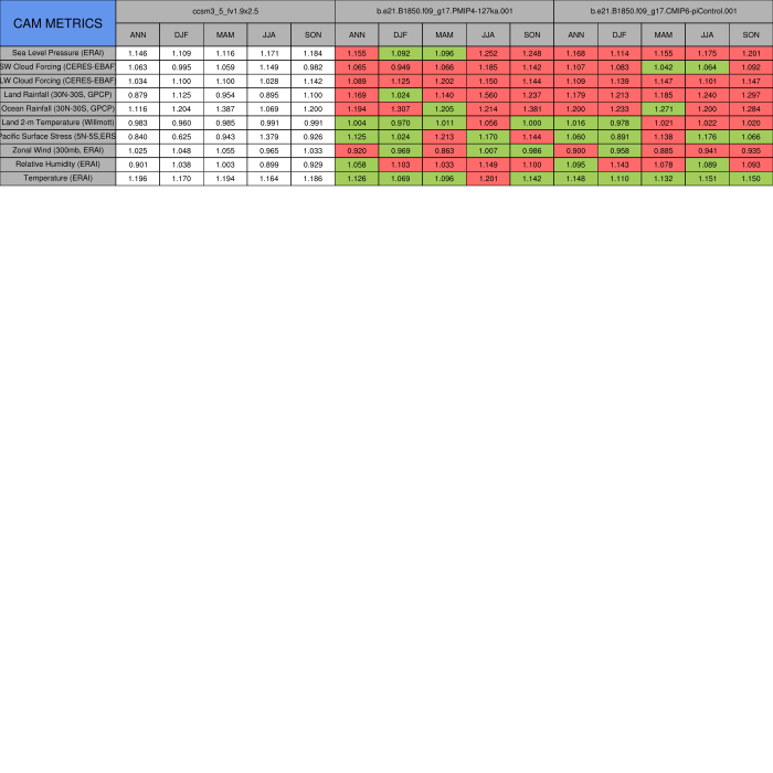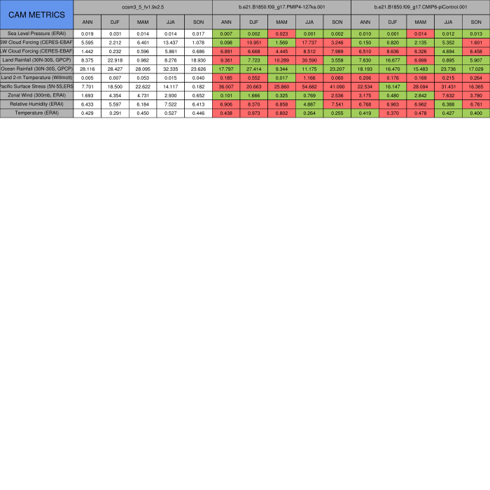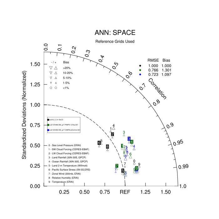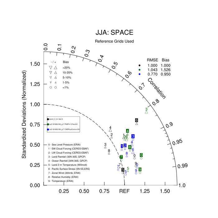 Taylor Diagrams were developed by Karl Taylor at PCMDI (paper|tech note) and aim to condense information about variance and RMSE characteristics of a particular model run when compared with observations in a single diagram. The tables summarize the individual metrics for each variable considered including: