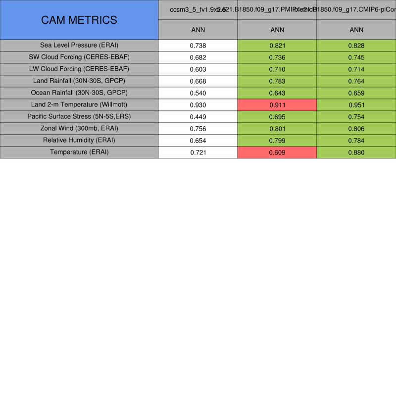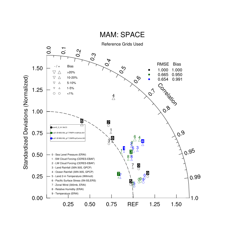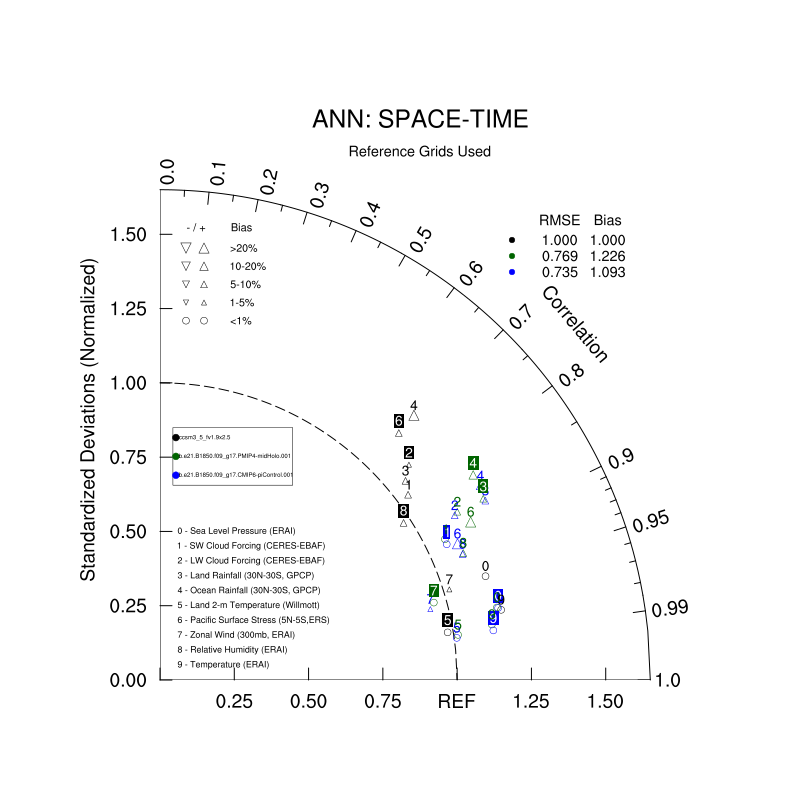 Taylor Diagrams were developed by Karl Taylor at PCMDI (paper|tech note) and aim to condense information about variance and RMSE characteristics of a particular model run when compared with observations in a single diagram. The tables summarize the individual metrics for each variable considered including: