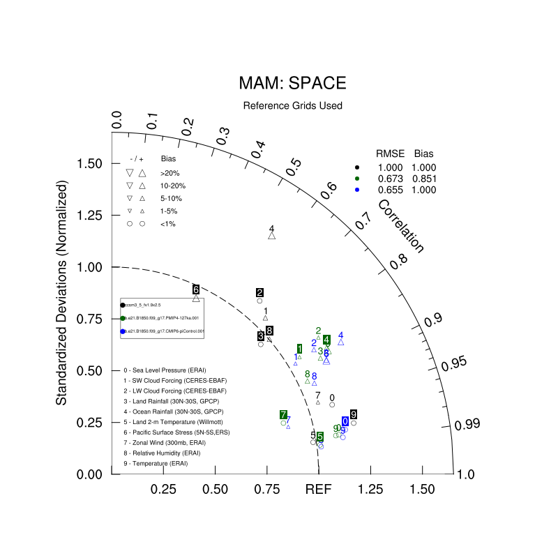 Taylor Diagrams were developed by Karl Taylor at PCMDI (paper|tech note) and aim to condense information about variance and RMSE characteristics of a particular model run when compared with observations in a single diagram. The tables summarize the individual metrics for each variable considered including: