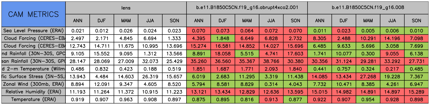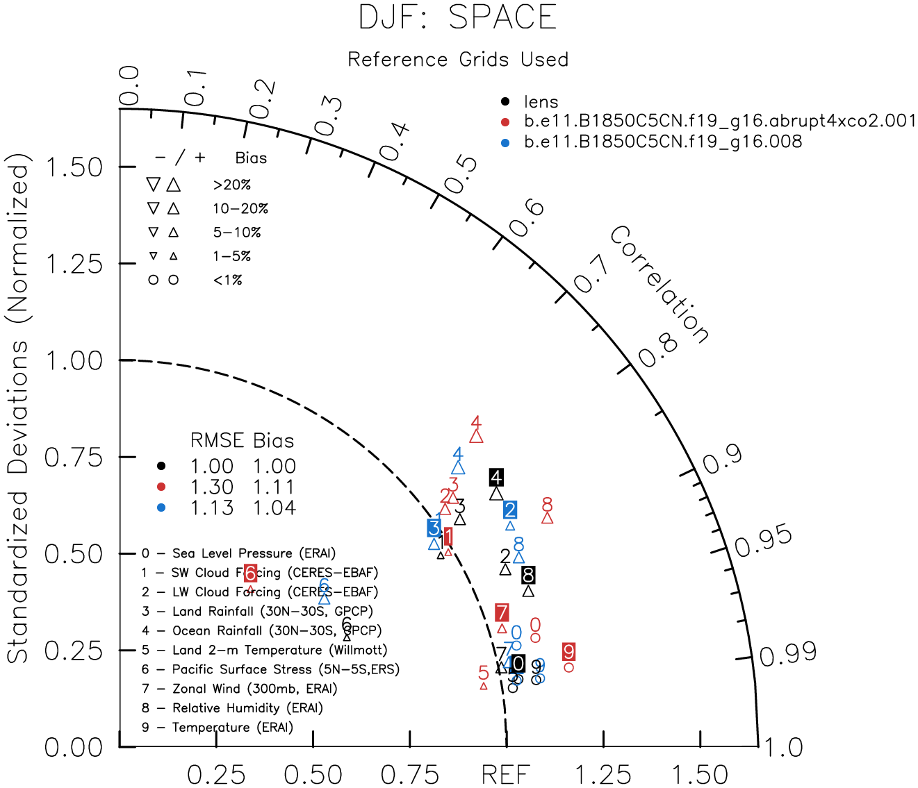 Taylor Diagrams were developed by Karl Taylor at PCMDI (paper|tech note) and aim to condense information about variance and RMSE characteristics of a particular model run when compared with observations in a single diagram. The tables summarize the individual metrics for each variable considered including: