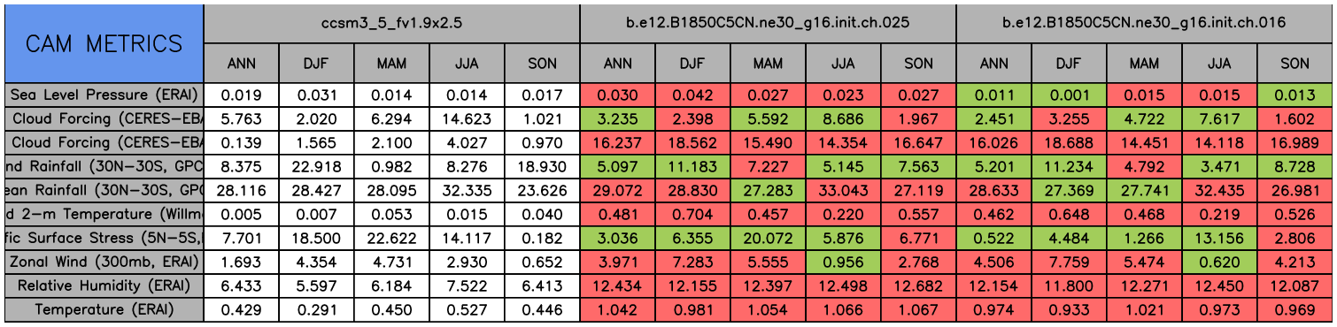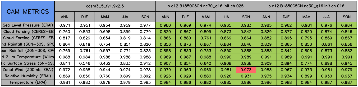 Taylor Diagrams were developed by Karl Taylor at PCMDI (paper|tech note) and aim to condense information about variance and RMSE characteristics of a particular model run when compared with observations in a single diagram. The tables summarize the individual metrics for each variable considered including:
