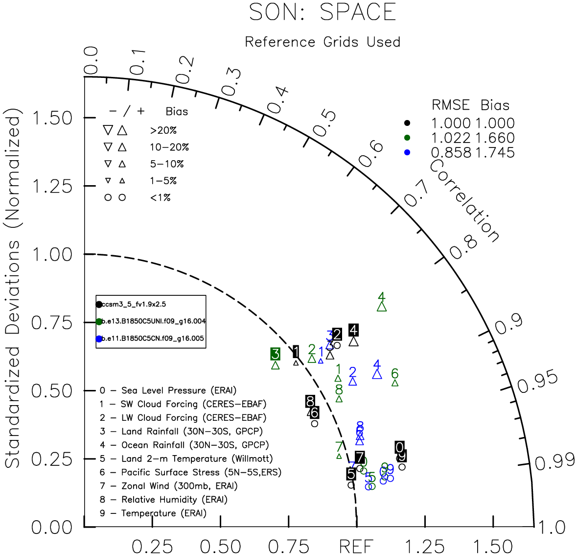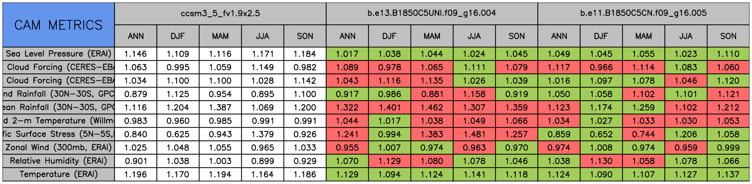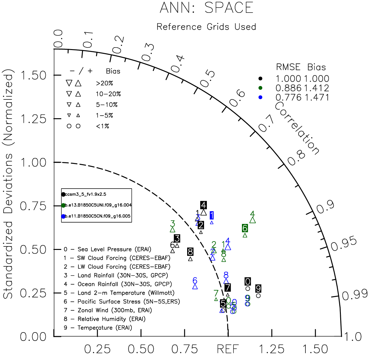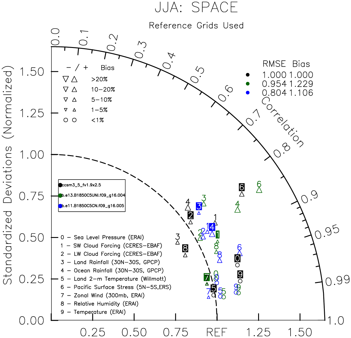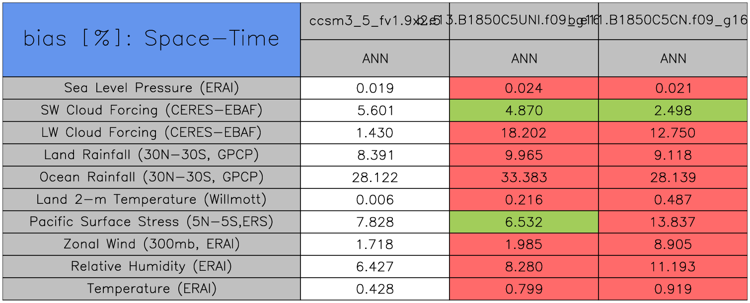 Taylor Diagrams were developed by Karl Taylor at PCMDI (paper|tech note) and aim to condense information about variance and RMSE characteristics of a particular model run when compared with observations in a single diagram. The tables summarize the individual metrics for each variable considered including: