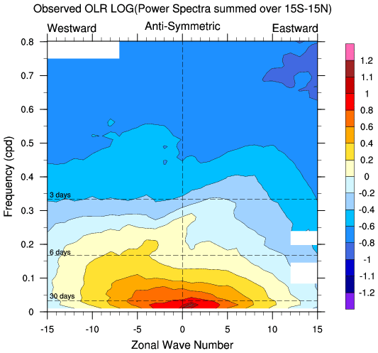 Zonal wavenumber-frequency logarithm of power spectra calculated from 06Z and