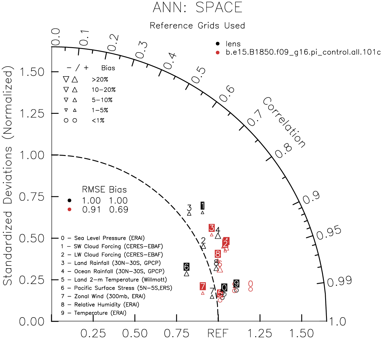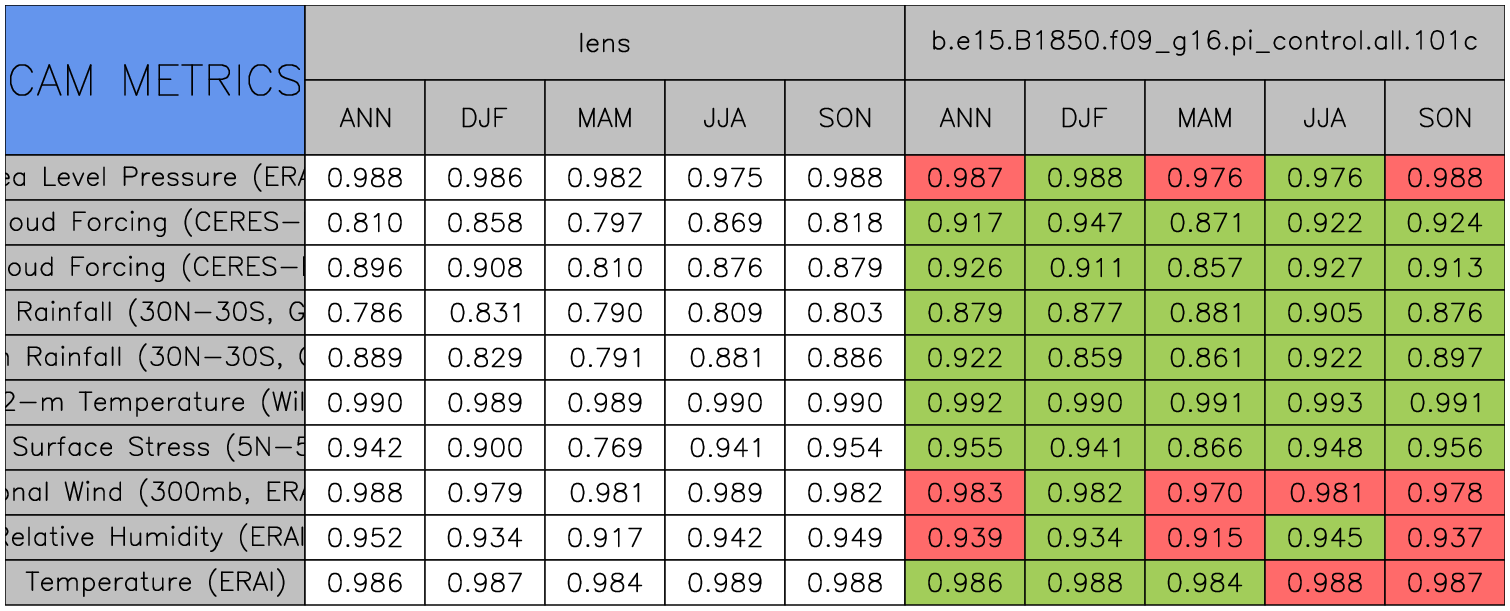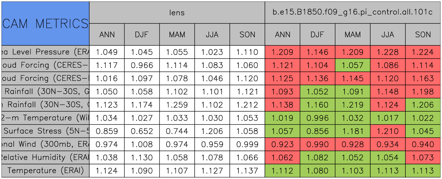 Taylor Diagrams were developed by Karl Taylor at PCMDI (paper|tech note) and aim to condense information about variance and RMSE characteristics of a particular model run when compared with observations in a single diagram. The tables summarize the individual metrics for each variable considered including: