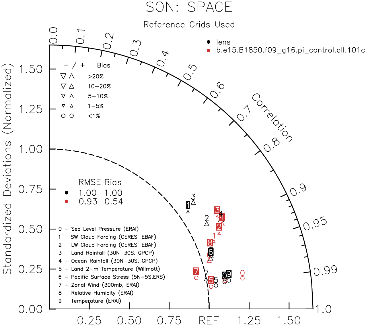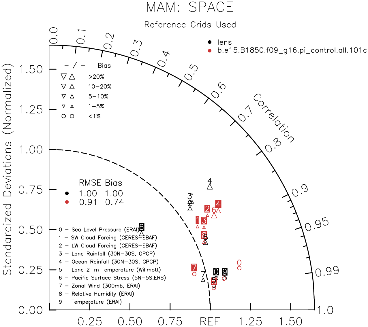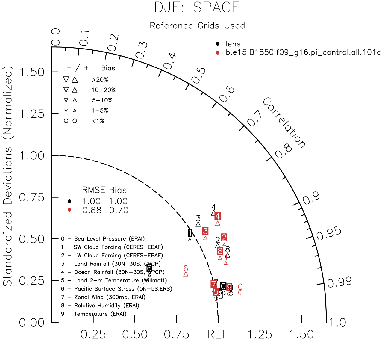 Taylor Diagrams were developed by Karl Taylor at PCMDI (paper|tech note) and aim to condense information about variance and RMSE characteristics of a particular model run when compared with observations in a single diagram. The tables summarize the individual metrics for each variable considered including: