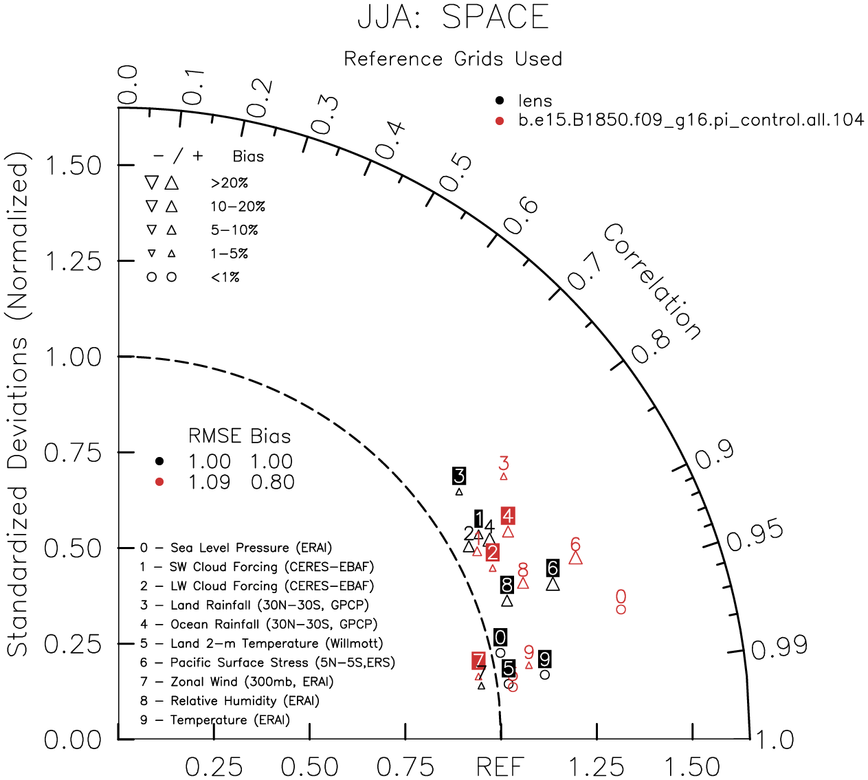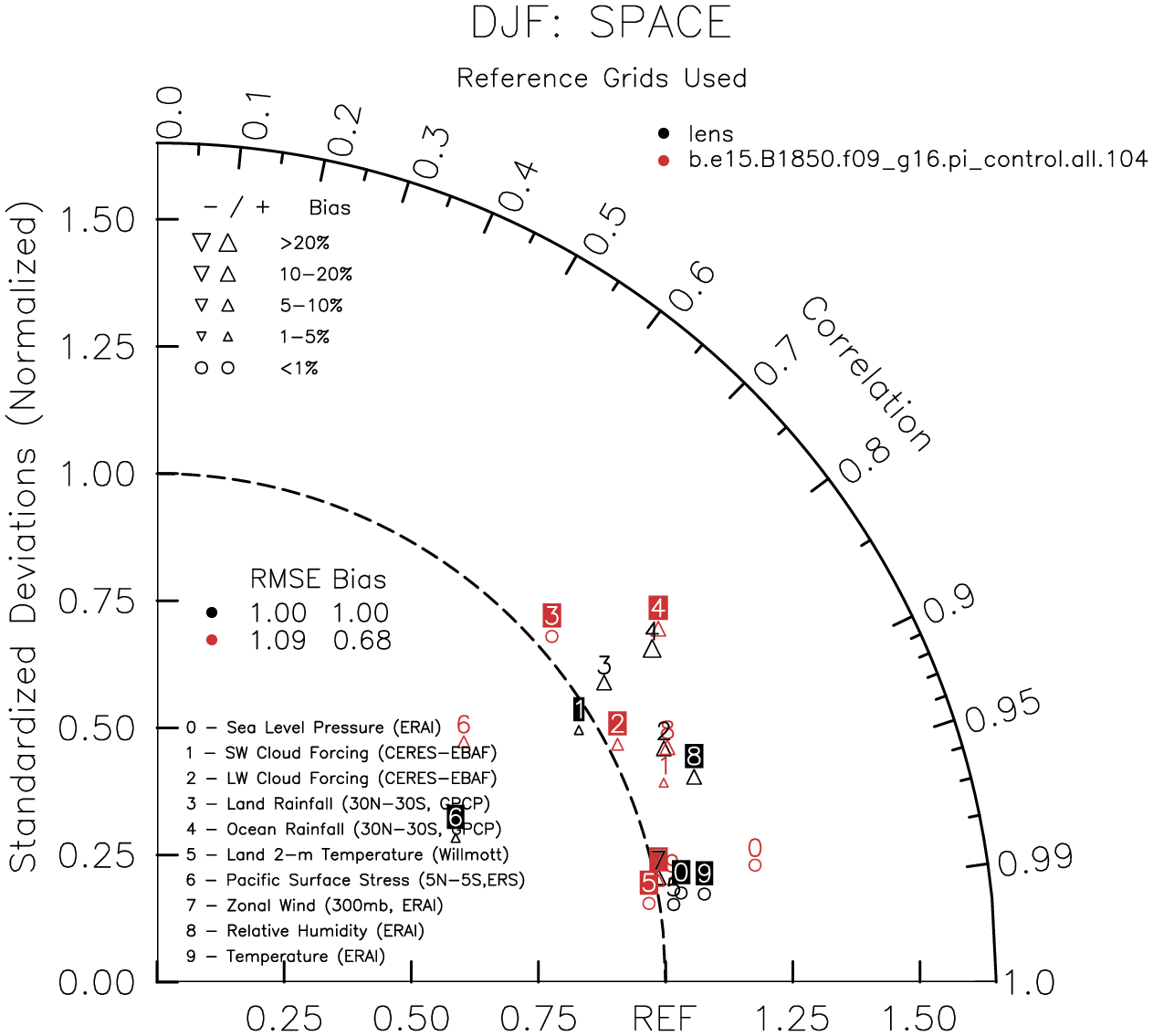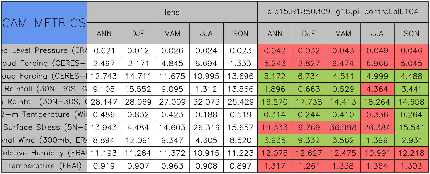 Taylor Diagrams were developed by Karl Taylor at PCMDI (paper|tech note) and aim to condense information about variance and RMSE characteristics of a particular model run when compared with observations in a single diagram. The tables summarize the individual metrics for each variable considered including: