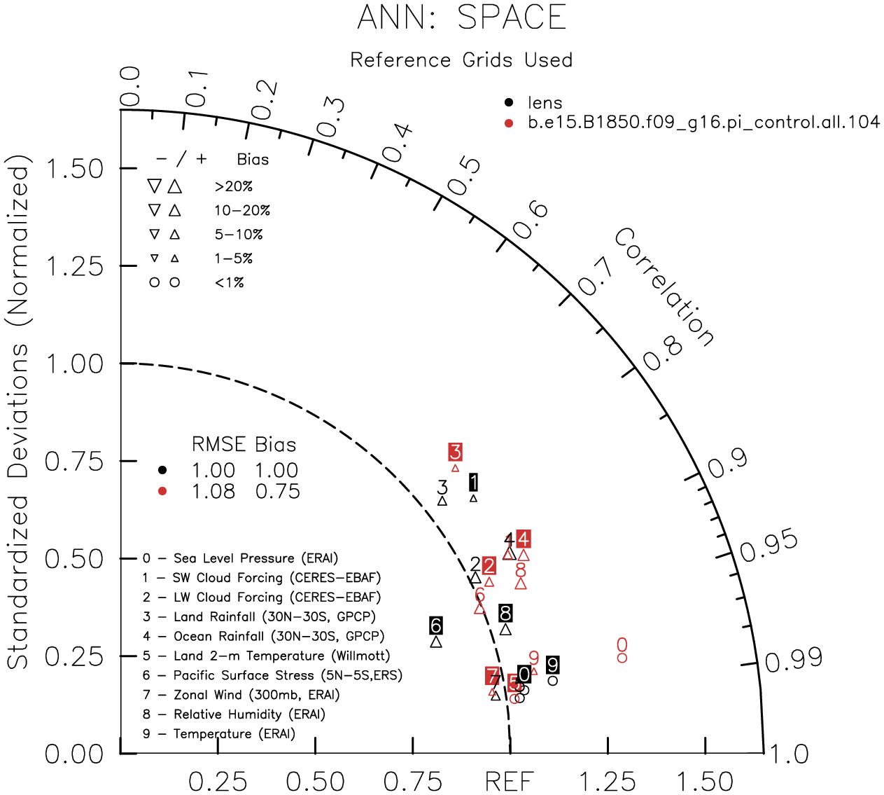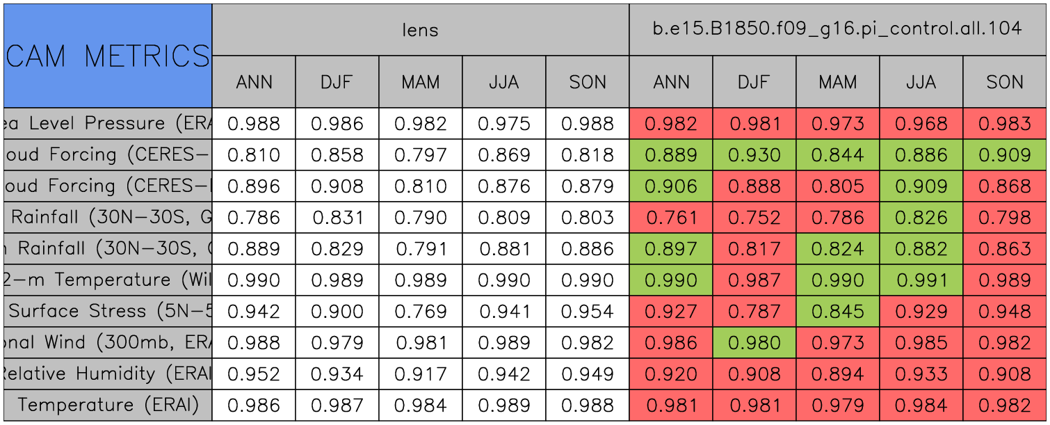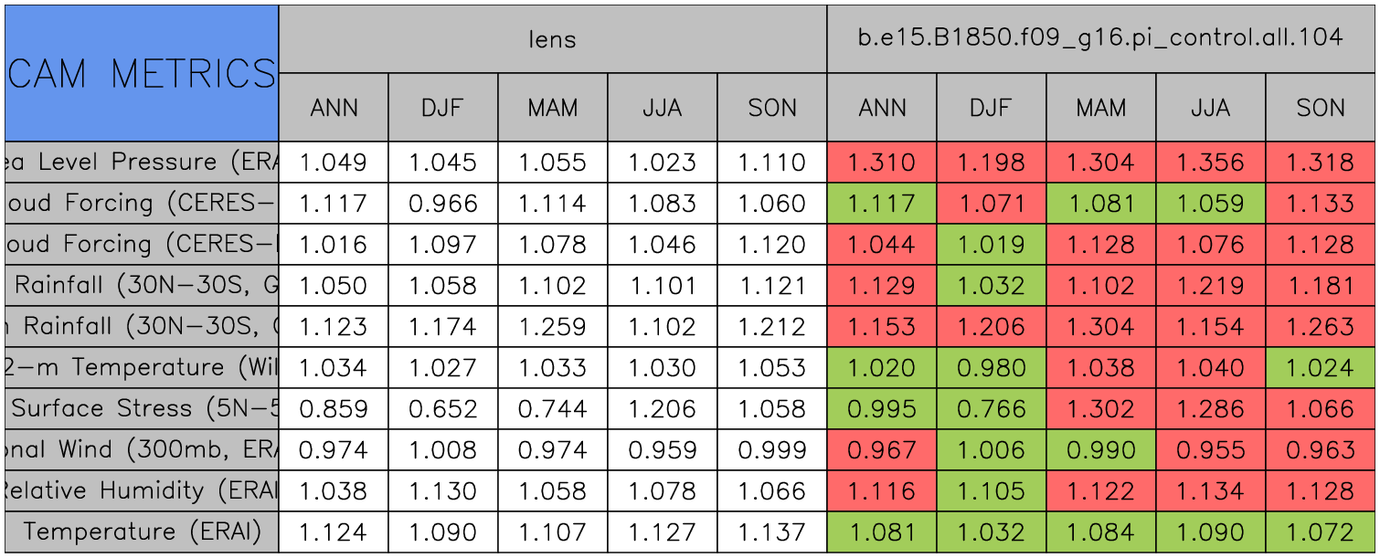 Taylor Diagrams were developed by Karl Taylor at PCMDI (paper|tech note) and aim to condense information about variance and RMSE characteristics of a particular model run when compared with observations in a single diagram. The tables summarize the individual metrics for each variable considered including: