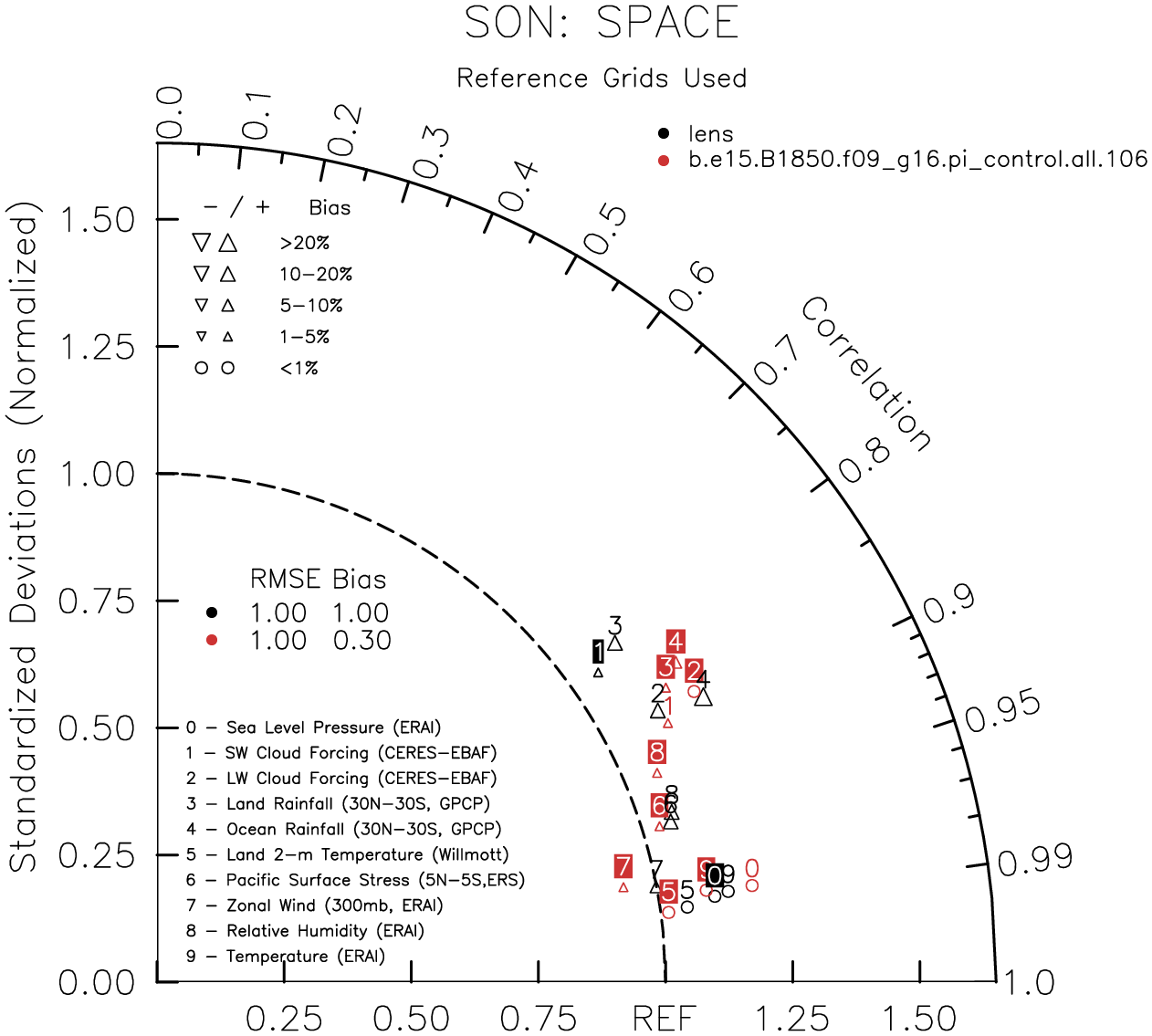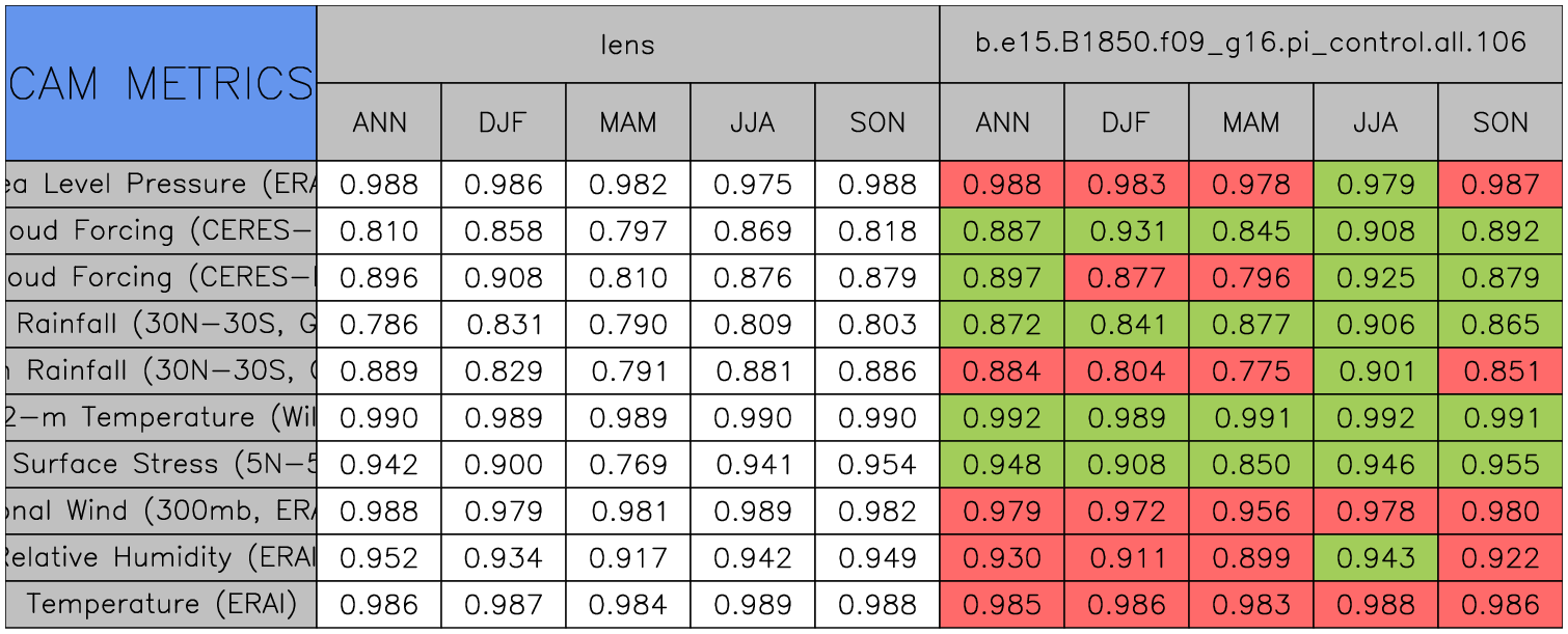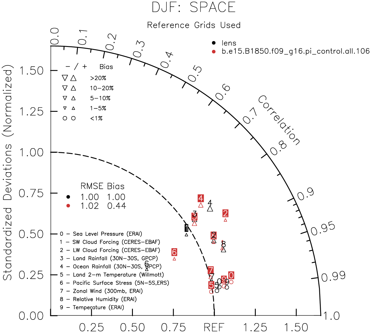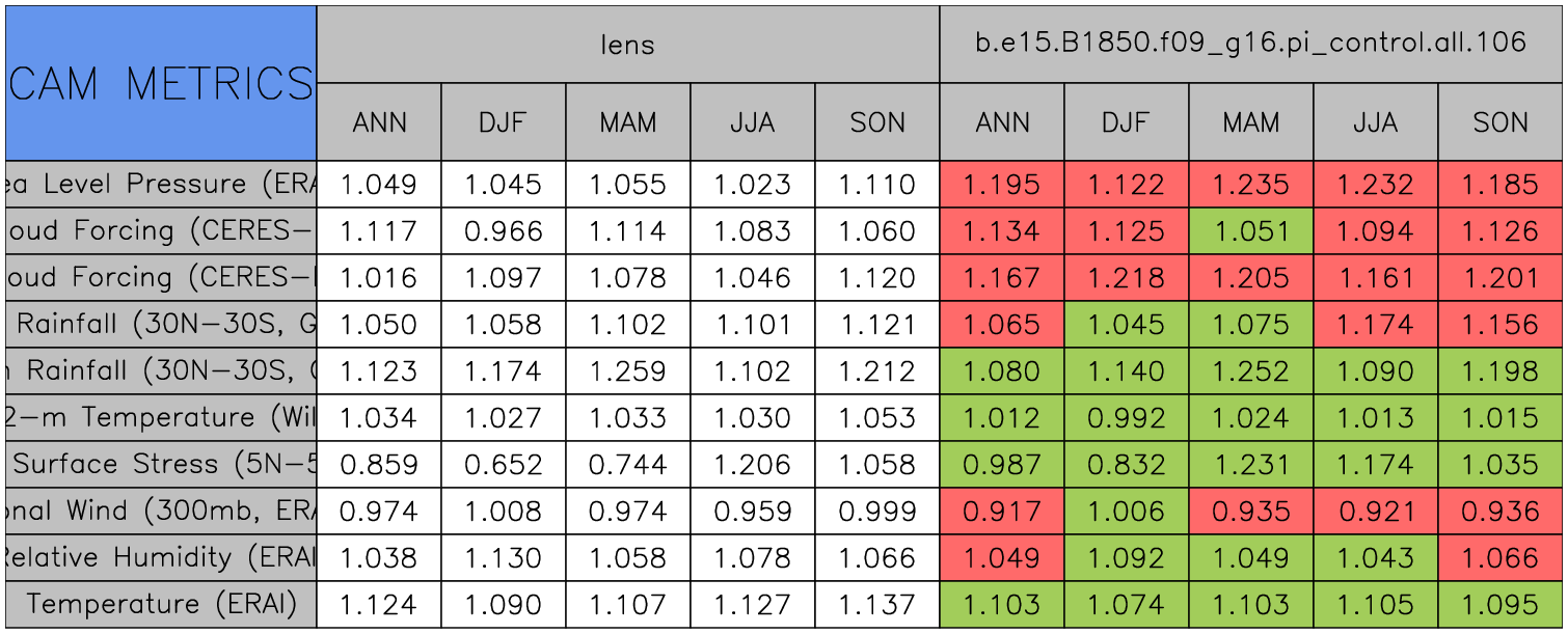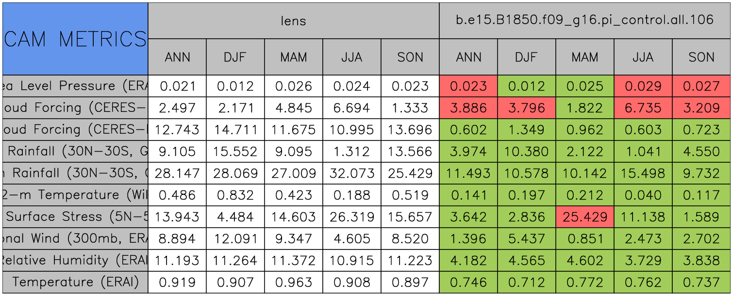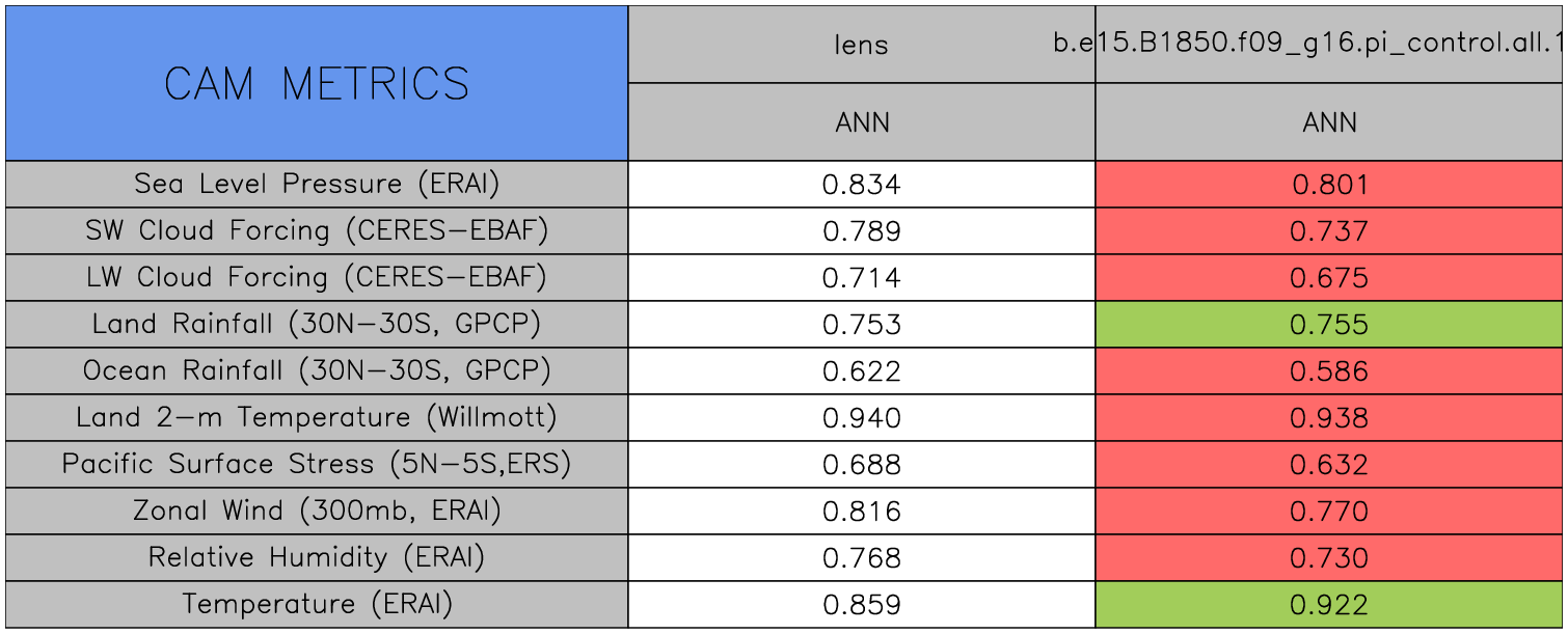Taylor Diagrams were developed by Karl Taylor at PCMDI (paper|tech note) and aim to condense information about variance and RMSE characteristics of a particular model run when compared with observations in a single diagram. The tables summarize the individual metrics for each variable considered including: