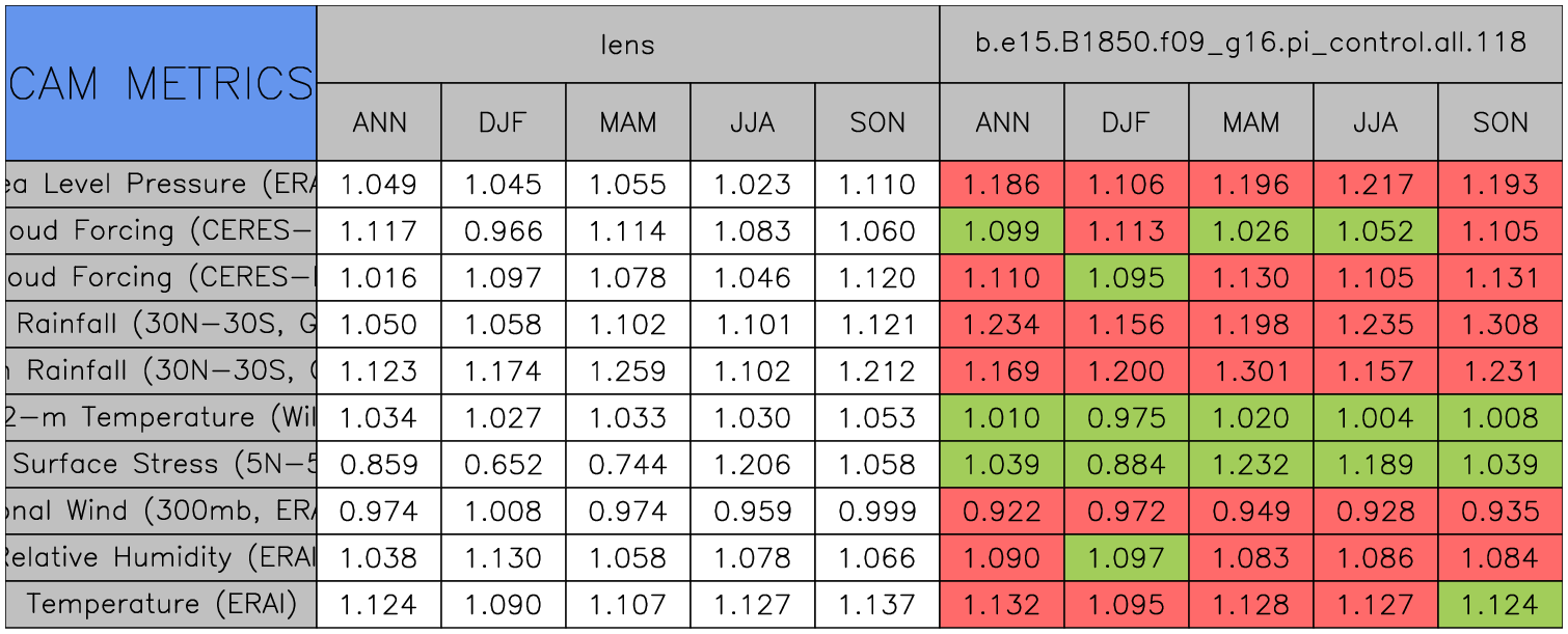 Taylor Diagrams were developed by Karl Taylor at PCMDI (paper|tech note) and aim to condense information about variance and RMSE characteristics of a particular model run when compared with observations in a single diagram. The tables summarize the individual metrics for each variable considered including: