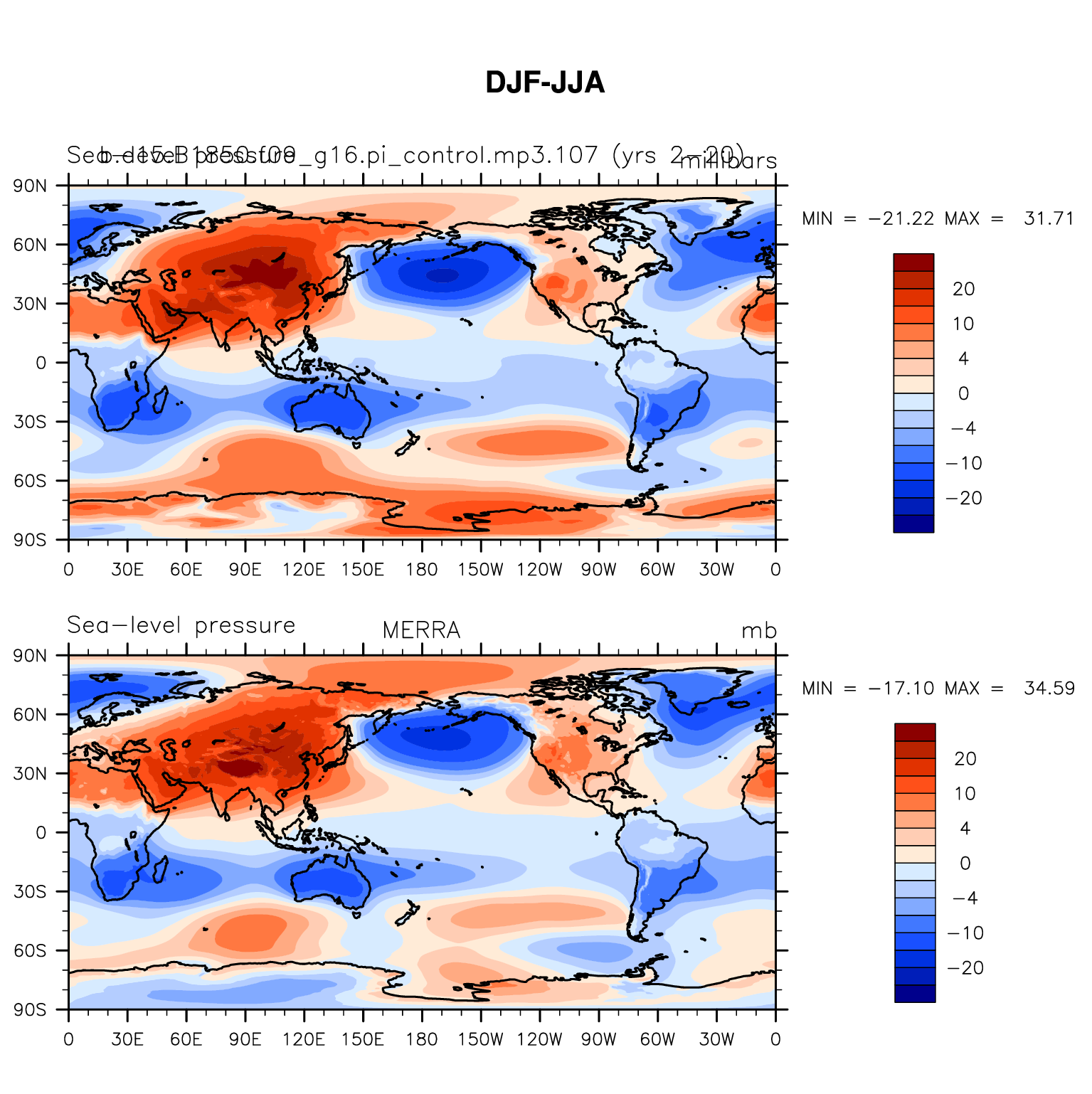 b.e15.B1850.f09_g16.pi_control.mp3.107 DIAG Set 9 - Horizontal contour plots of DJF-JJA differences