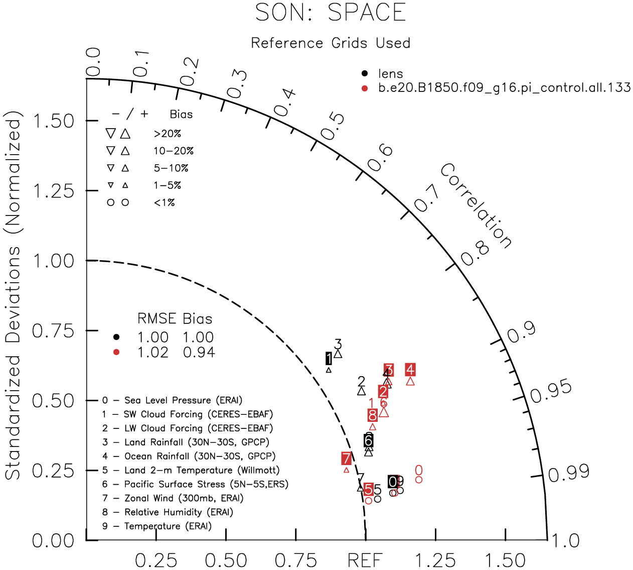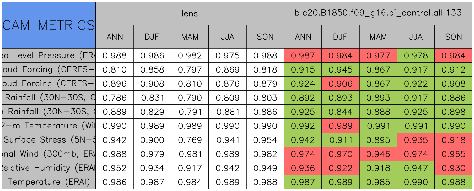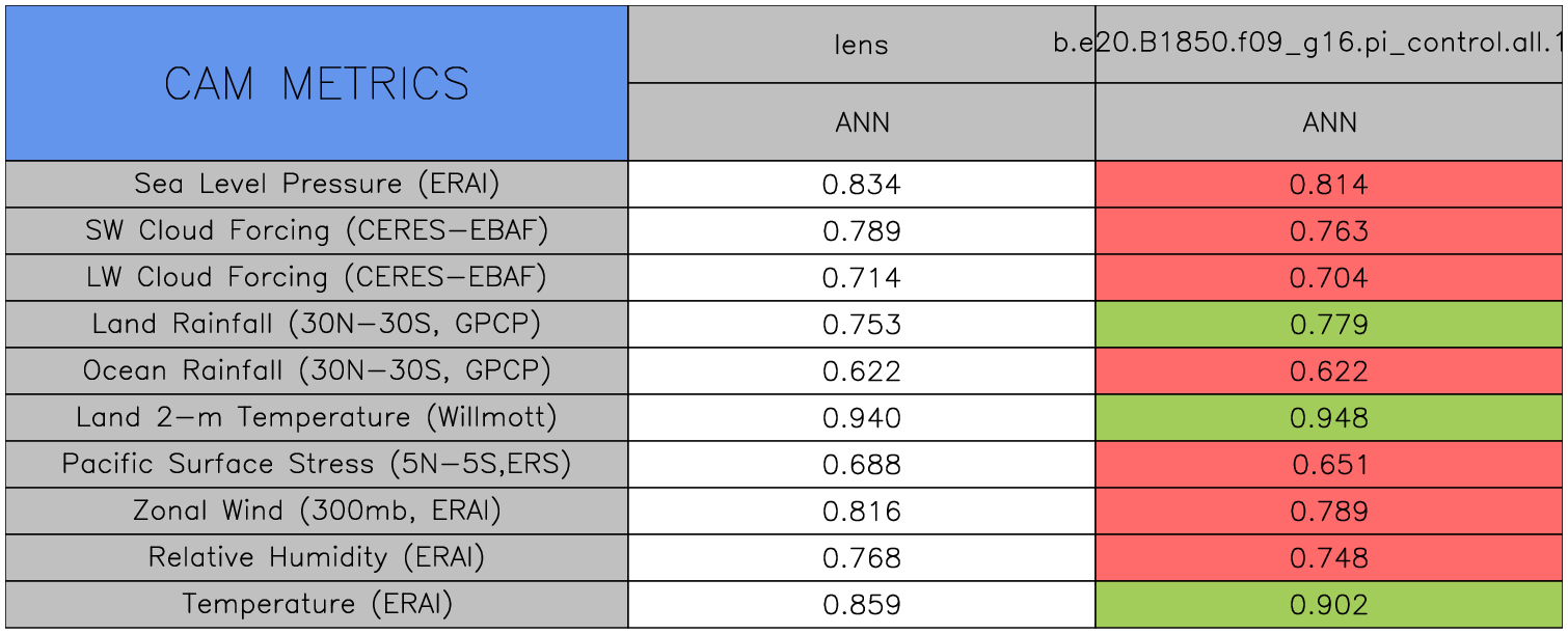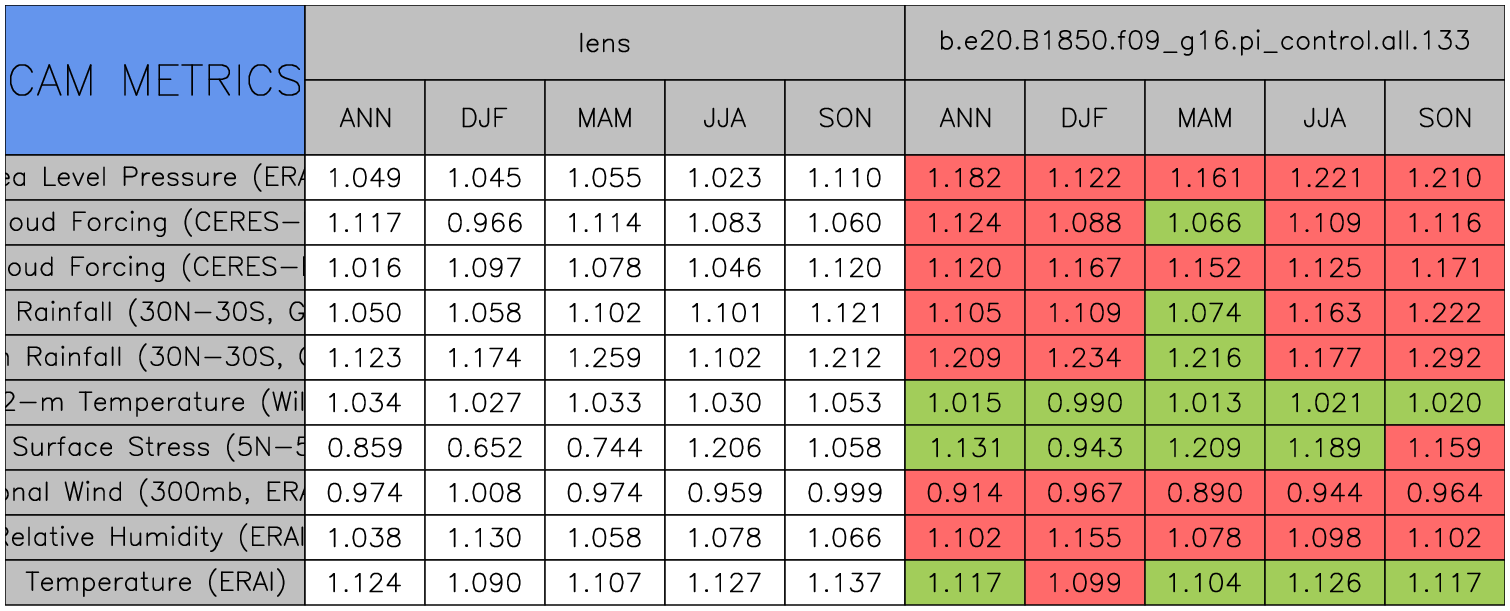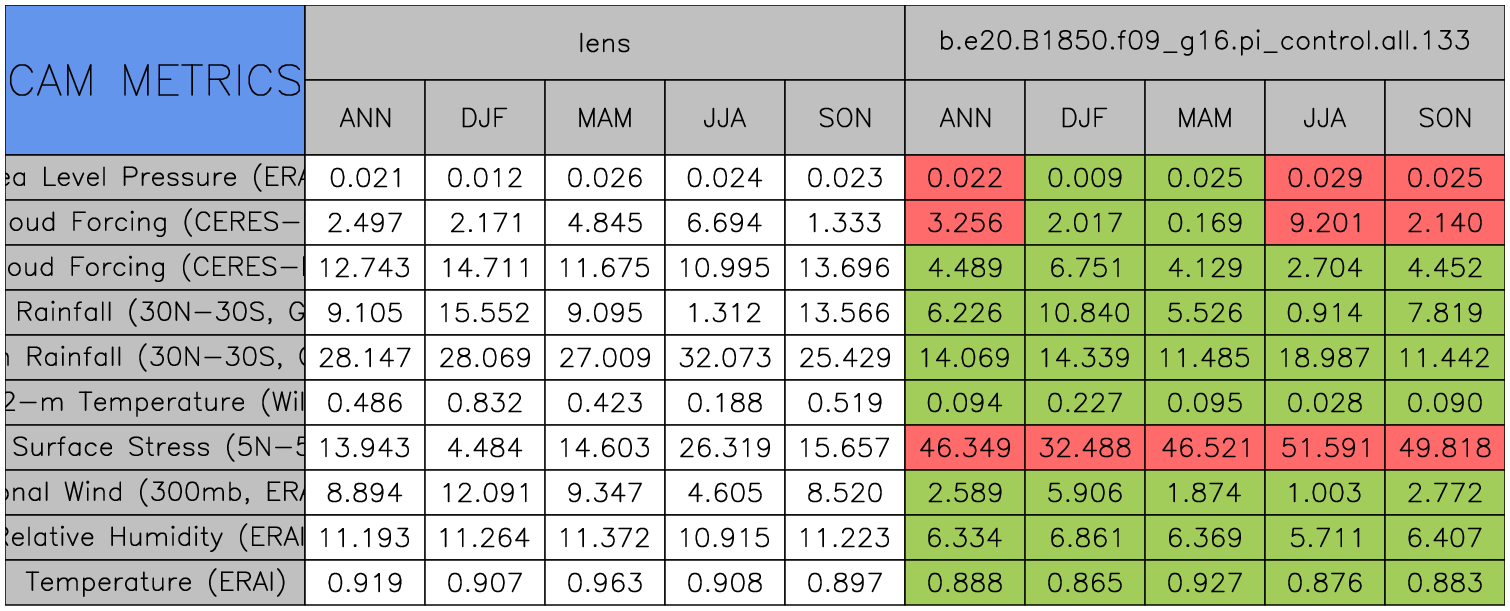 Taylor Diagrams were developed by Karl Taylor at PCMDI (paper|tech note) and aim to condense information about variance and RMSE characteristics of a particular model run when compared with observations in a single diagram. The tables summarize the individual metrics for each variable considered including: