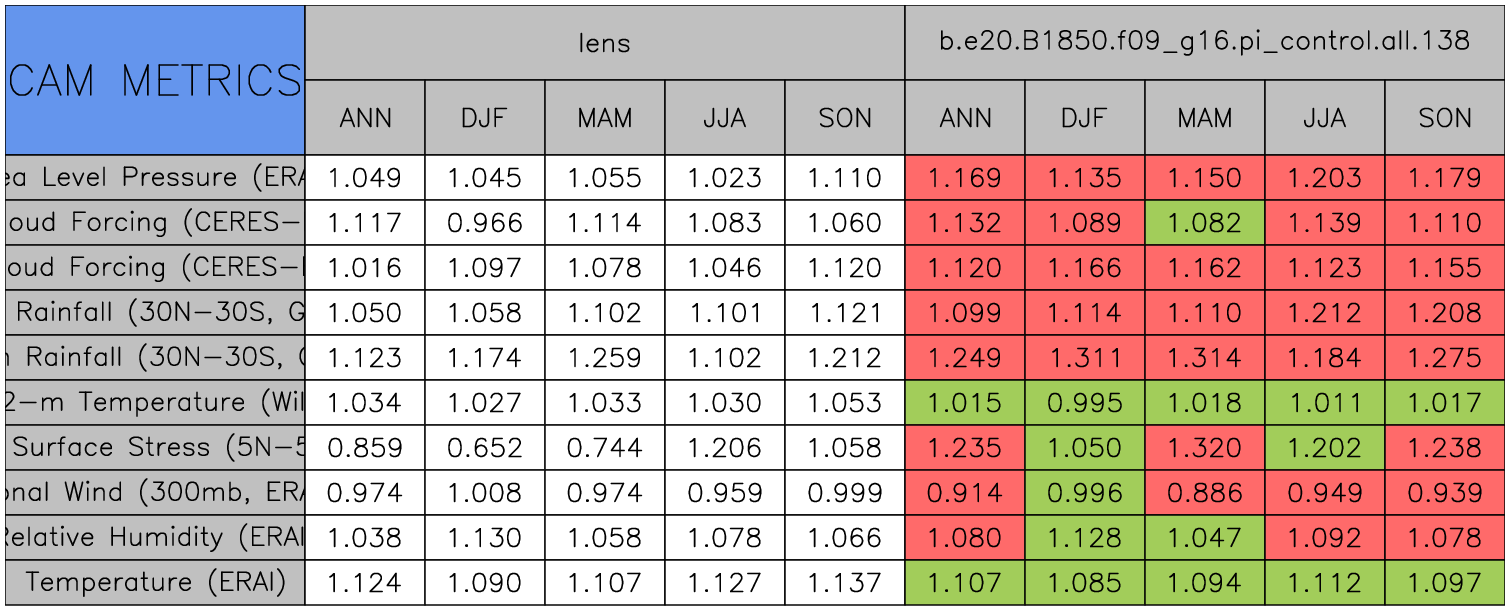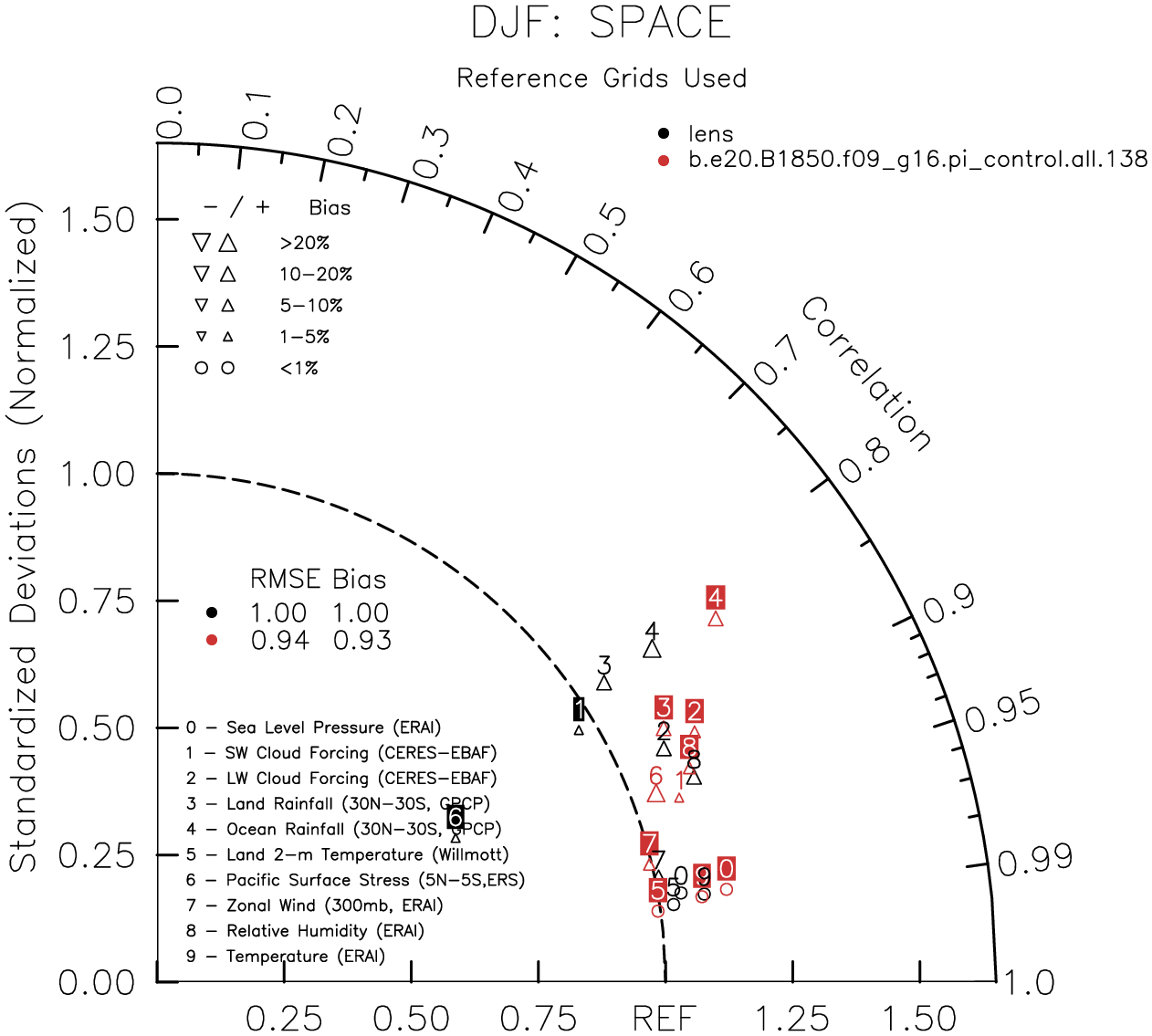 Taylor Diagrams were developed by Karl Taylor at PCMDI (paper|tech note) and aim to condense information about variance and RMSE characteristics of a particular model run when compared with observations in a single diagram. The tables summarize the individual metrics for each variable considered including: