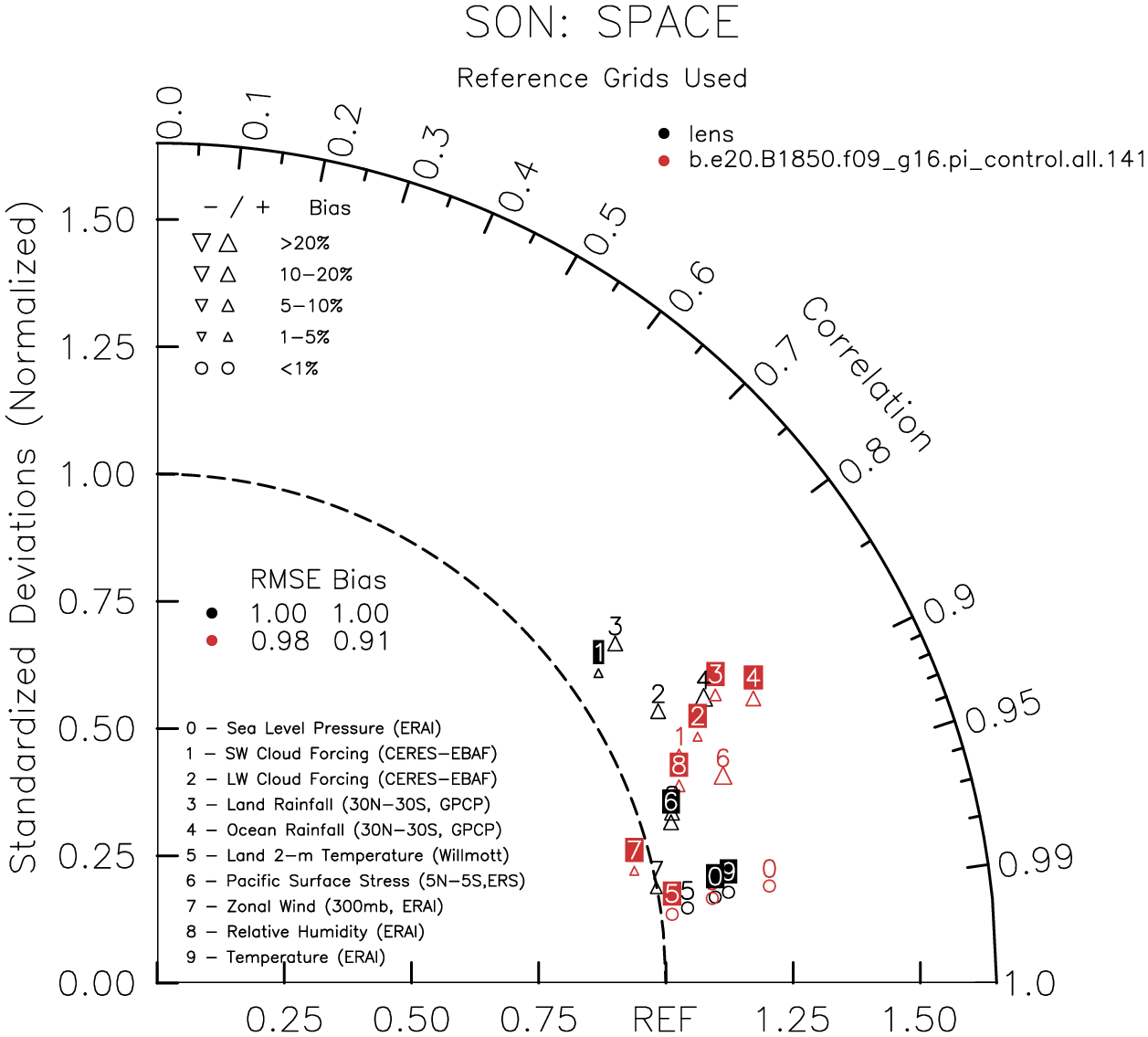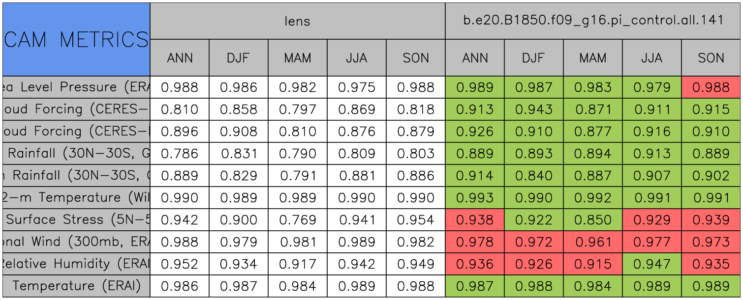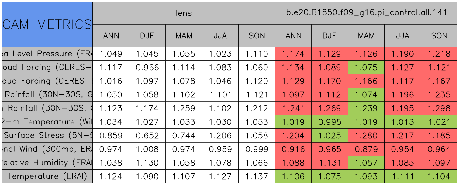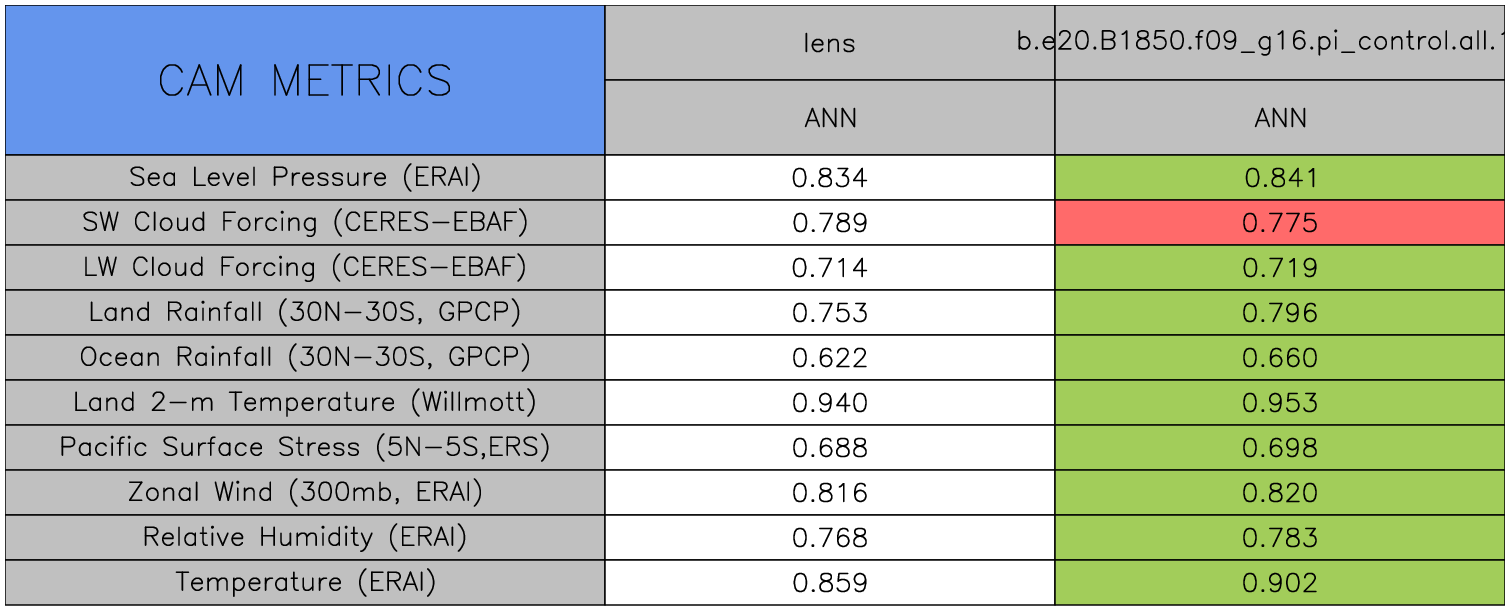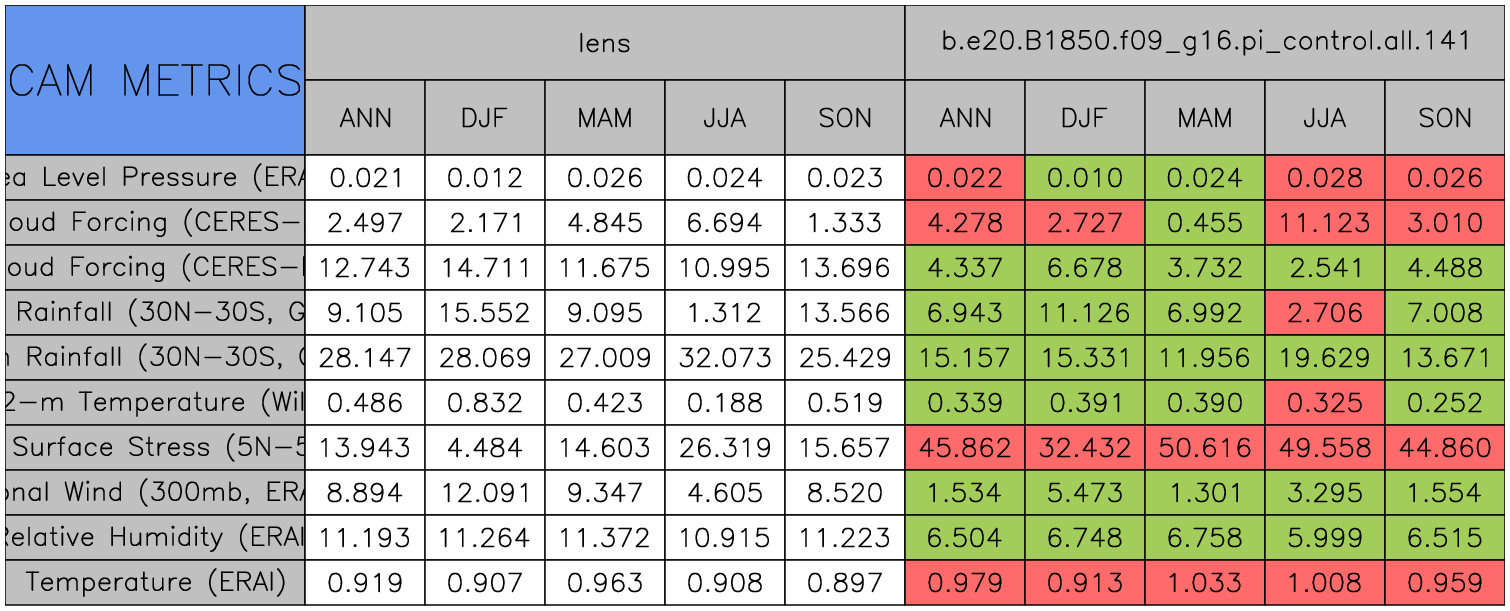 Taylor Diagrams were developed by Karl Taylor at PCMDI (paper|tech note) and aim to condense information about variance and RMSE characteristics of a particular model run when compared with observations in a single diagram. The tables summarize the individual metrics for each variable considered including: