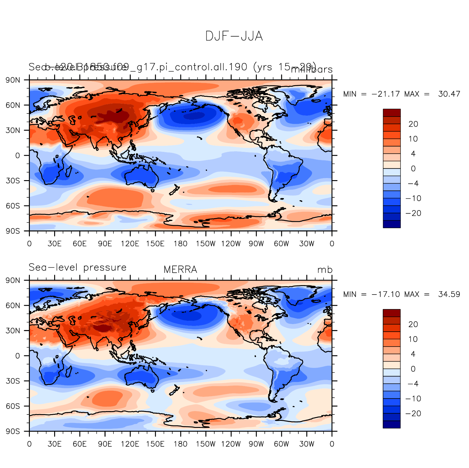 b.e20.B1850.f09_g17.pi_control.all.190 DIAG Set 9 - Horizontal contour plots of DJF-JJA differences
