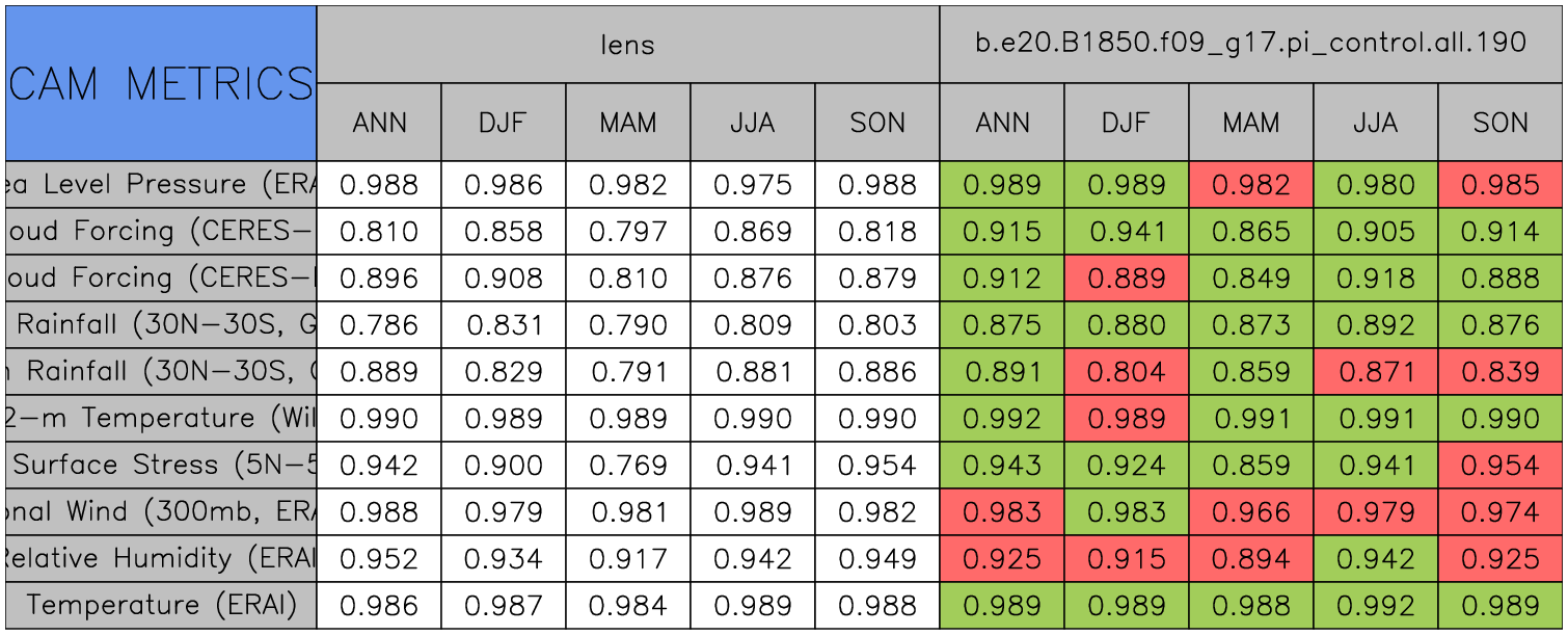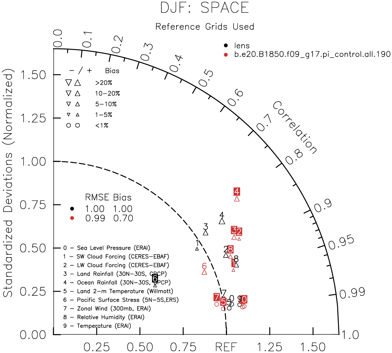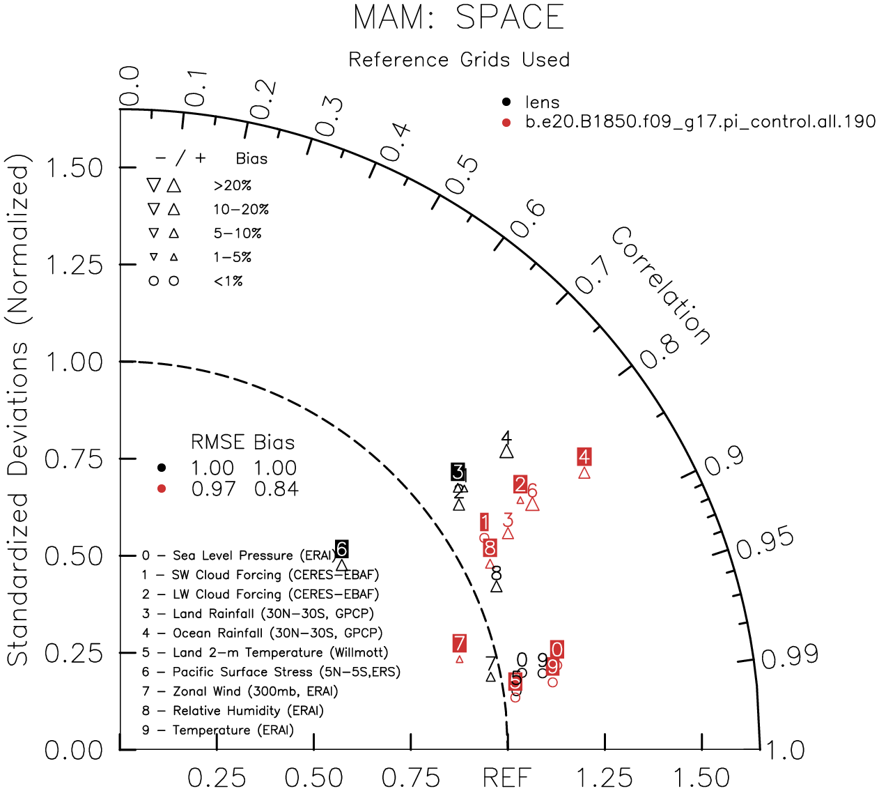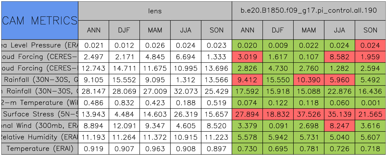 Taylor Diagrams were developed by Karl Taylor at PCMDI (paper|tech note) and aim to condense information about variance and RMSE characteristics of a particular model run when compared with observations in a single diagram. The tables summarize the individual metrics for each variable considered including: