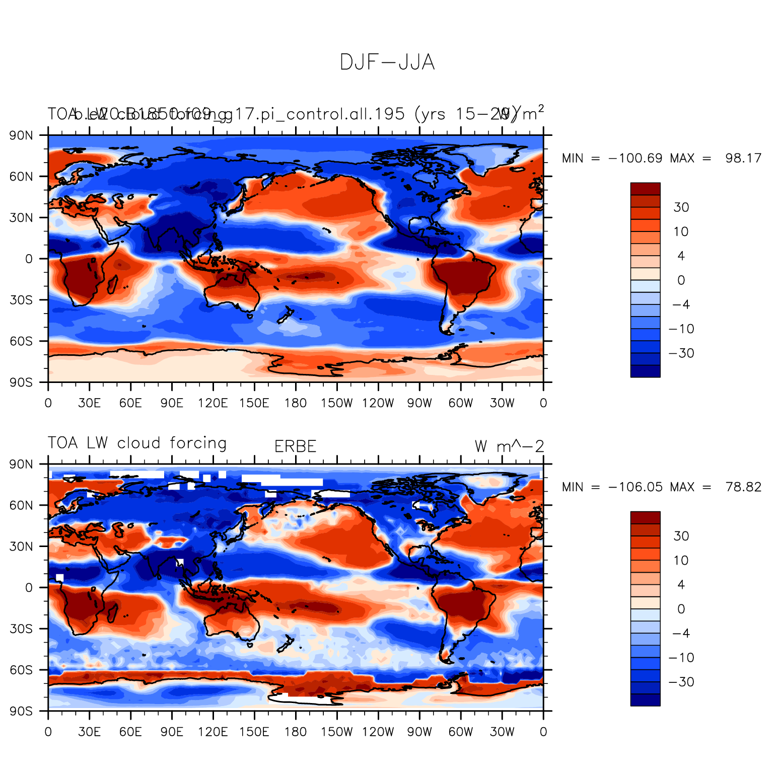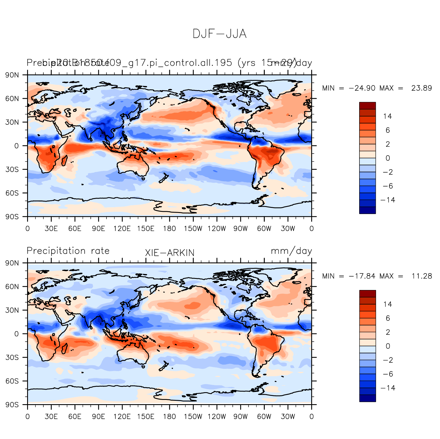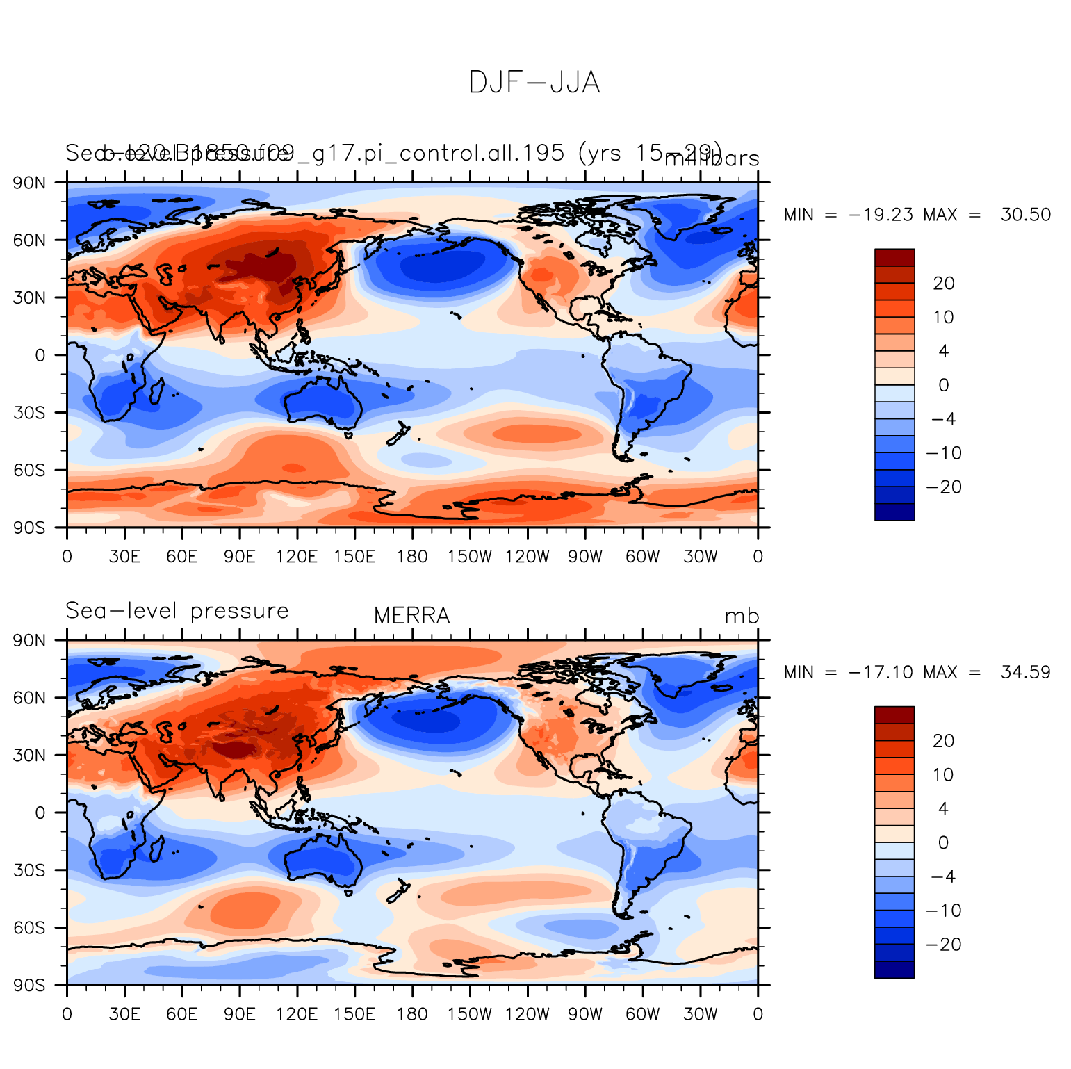 b.e20.B1850.f09_g17.pi_control.all.195 DIAG Set 9 - Horizontal contour plots of DJF-JJA differences