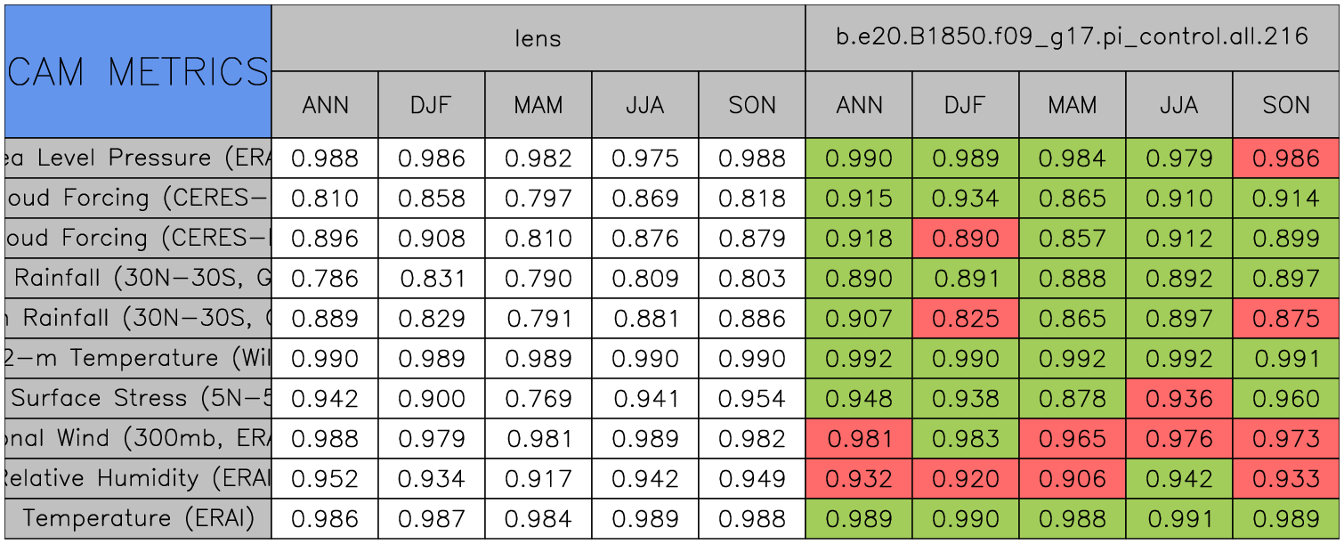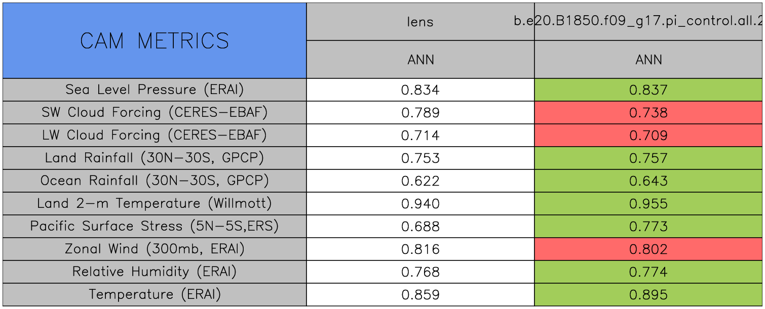 Taylor Diagrams were developed by Karl Taylor at PCMDI (paper|tech note) and aim to condense information about variance and RMSE characteristics of a particular model run when compared with observations in a single diagram. The tables summarize the individual metrics for each variable considered including: