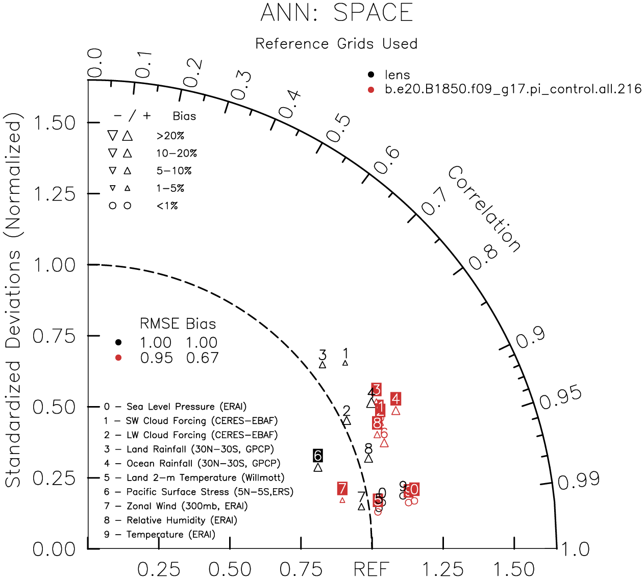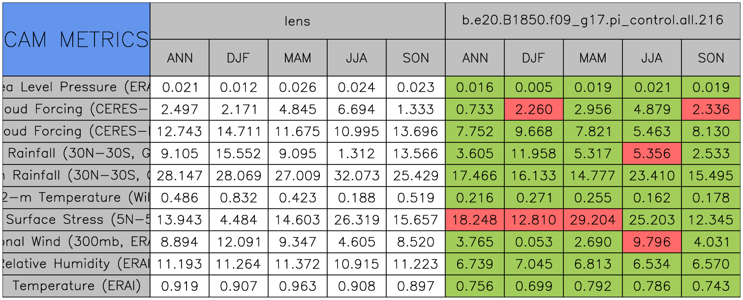 Taylor Diagrams were developed by Karl Taylor at PCMDI (paper|tech note) and aim to condense information about variance and RMSE characteristics of a particular model run when compared with observations in a single diagram. The tables summarize the individual metrics for each variable considered including:
