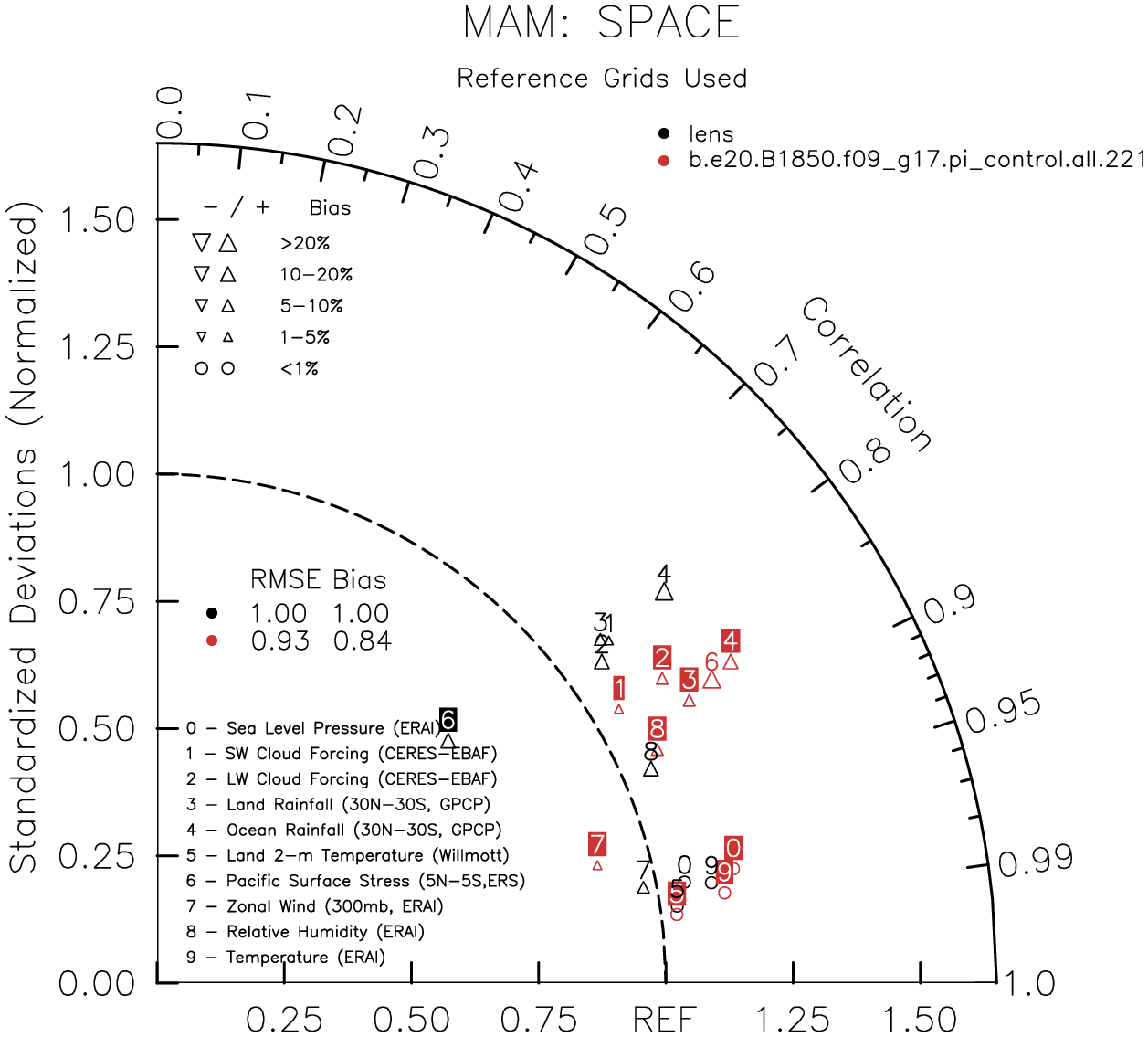 Taylor Diagrams were developed by Karl Taylor at PCMDI (paper|tech note) and aim to condense information about variance and RMSE characteristics of a particular model run when compared with observations in a single diagram. The tables summarize the individual metrics for each variable considered including: