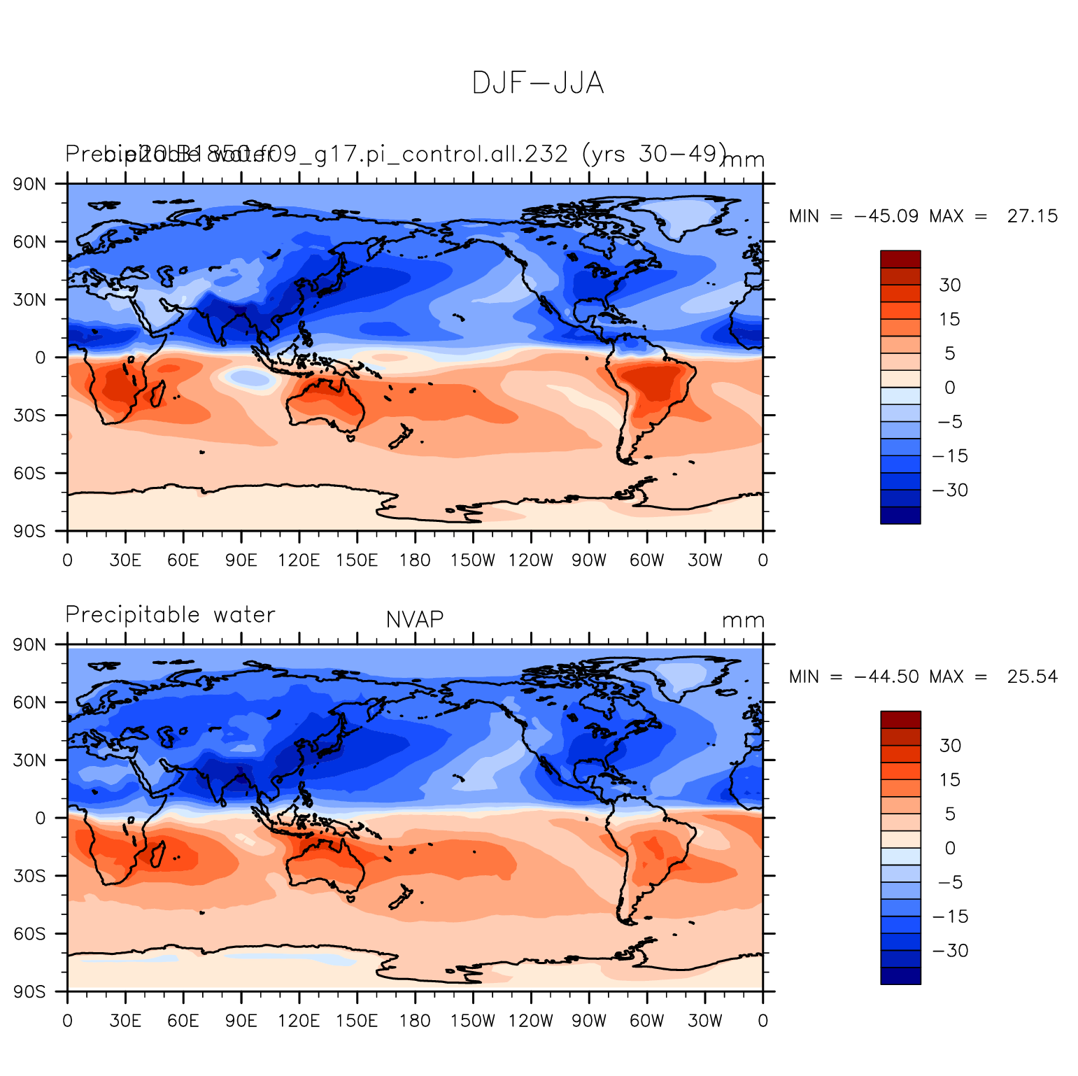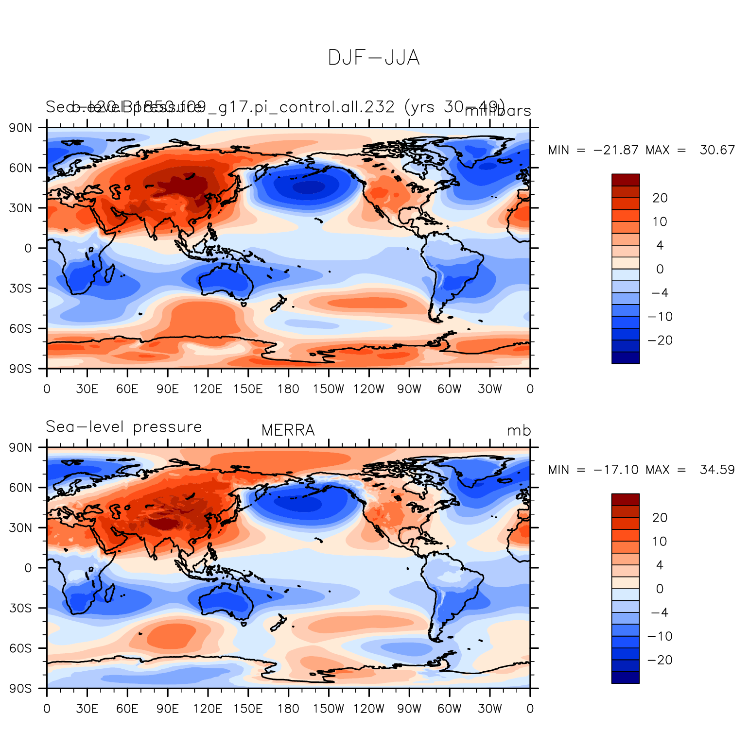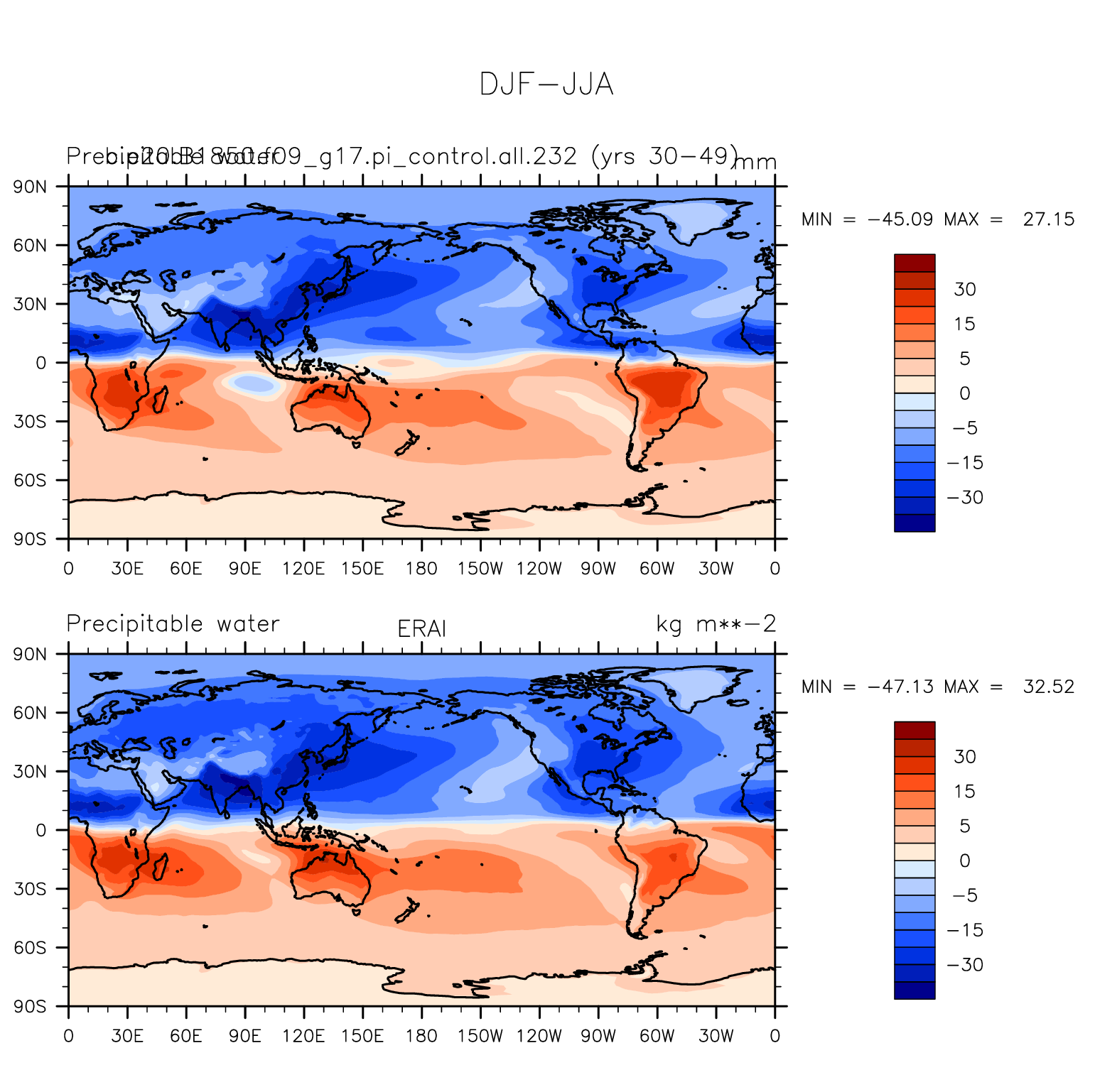 b.e20.B1850.f09_g17.pi_control.all.232 DIAG Set 9 - Horizontal contour plots of DJF-JJA differences