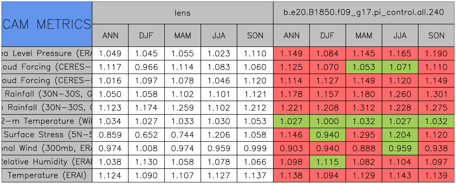 Taylor Diagrams were developed by Karl Taylor at PCMDI (paper|tech note) and aim to condense information about variance and RMSE characteristics of a particular model run when compared with observations in a single diagram. The tables summarize the individual metrics for each variable considered including: