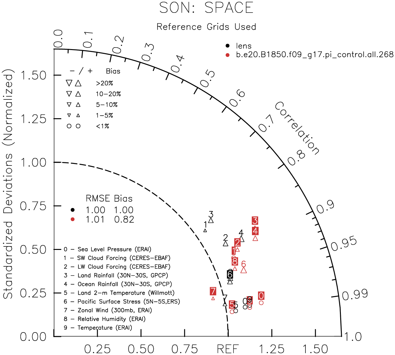 Taylor Diagrams were developed by Karl Taylor at PCMDI (paper|tech note) and aim to condense information about variance and RMSE characteristics of a particular model run when compared with observations in a single diagram. The tables summarize the individual metrics for each variable considered including:
