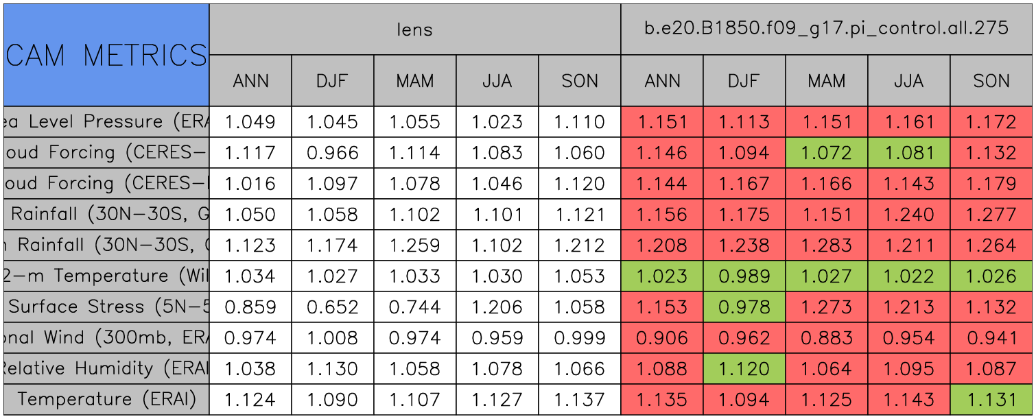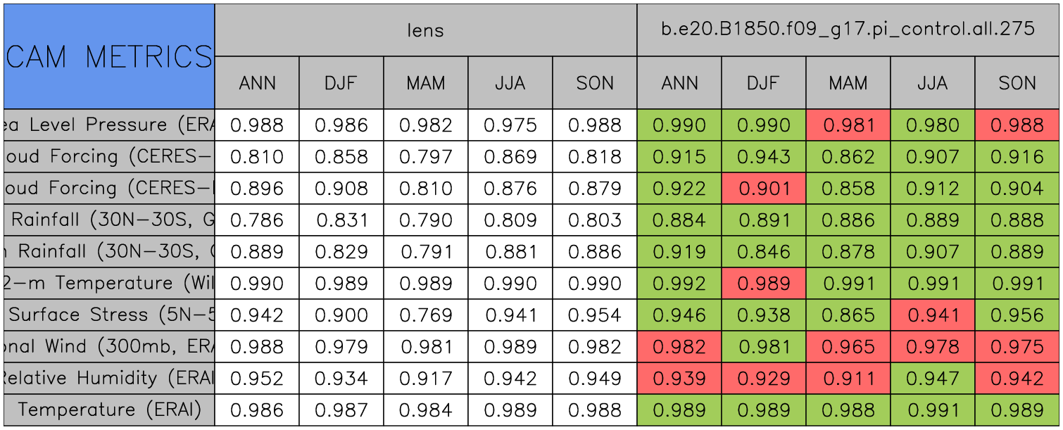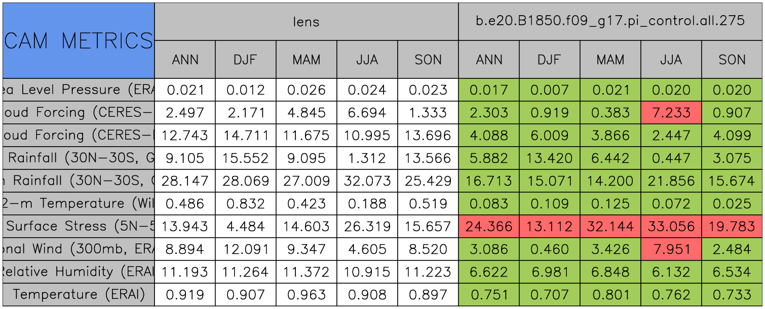 Taylor Diagrams were developed by Karl Taylor at PCMDI (paper|tech note) and aim to condense information about variance and RMSE characteristics of a particular model run when compared with observations in a single diagram. The tables summarize the individual metrics for each variable considered including: