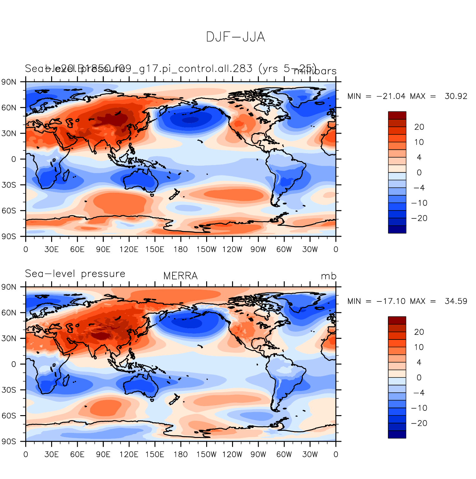 b.e20.B1850.f09_g17.pi_control.all.283 DIAG Set 9 - Horizontal contour plots of DJF-JJA differences