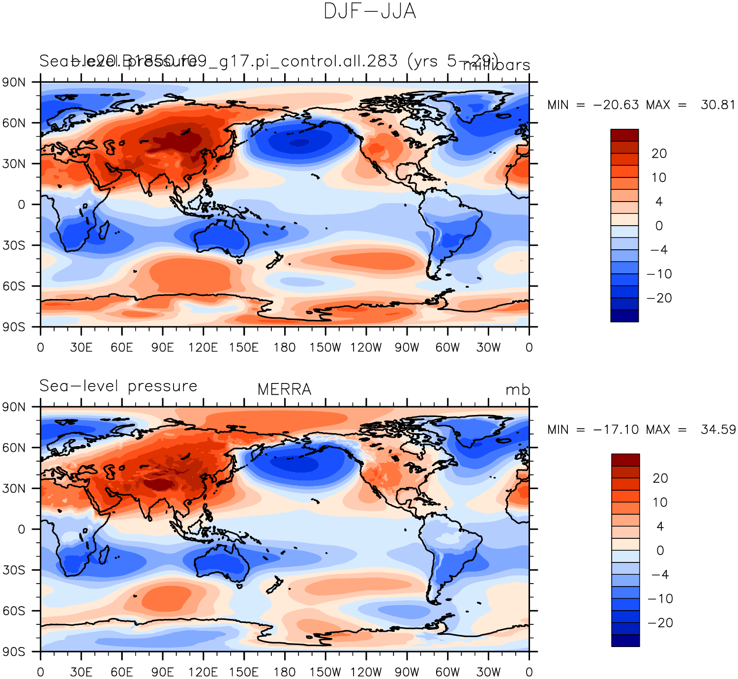 b.e20.B1850.f09_g17.pi_control.all.283 DIAG Set 9 - Horizontal contour plots of DJF-JJA differences