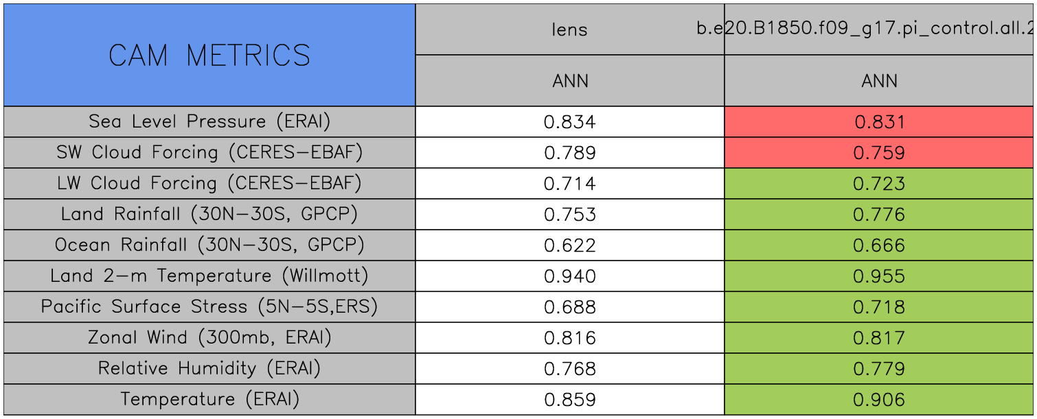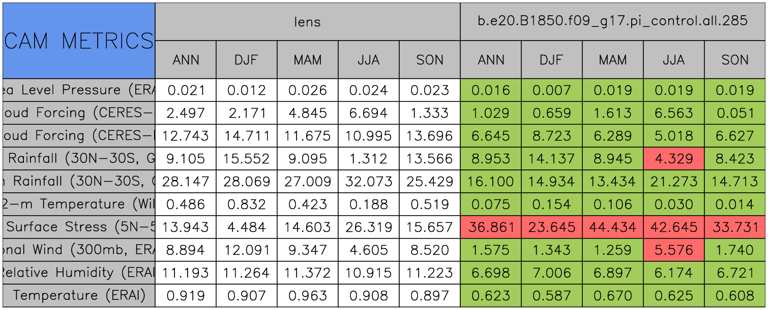 Taylor Diagrams were developed by Karl Taylor at PCMDI (paper|tech note) and aim to condense information about variance and RMSE characteristics of a particular model run when compared with observations in a single diagram. The tables summarize the individual metrics for each variable considered including: