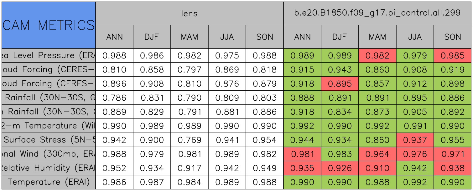 Taylor Diagrams were developed by Karl Taylor at PCMDI (paper|tech note) and aim to condense information about variance and RMSE characteristics of a particular model run when compared with observations in a single diagram. The tables summarize the individual metrics for each variable considered including: