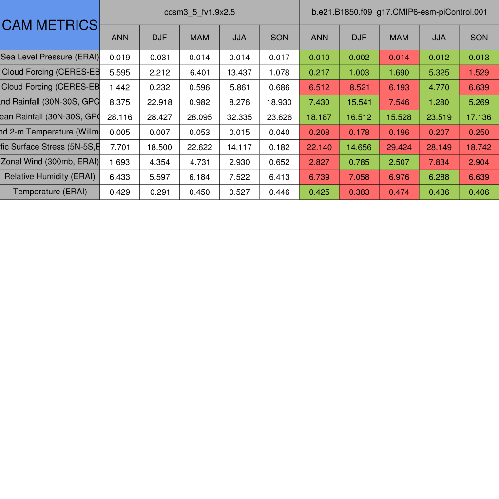 Taylor Diagrams were developed by Karl Taylor at PCMDI (paper|tech note) and aim to condense information about variance and RMSE characteristics of a particular model run when compared with observations in a single diagram. The tables summarize the individual metrics for each variable considered including: