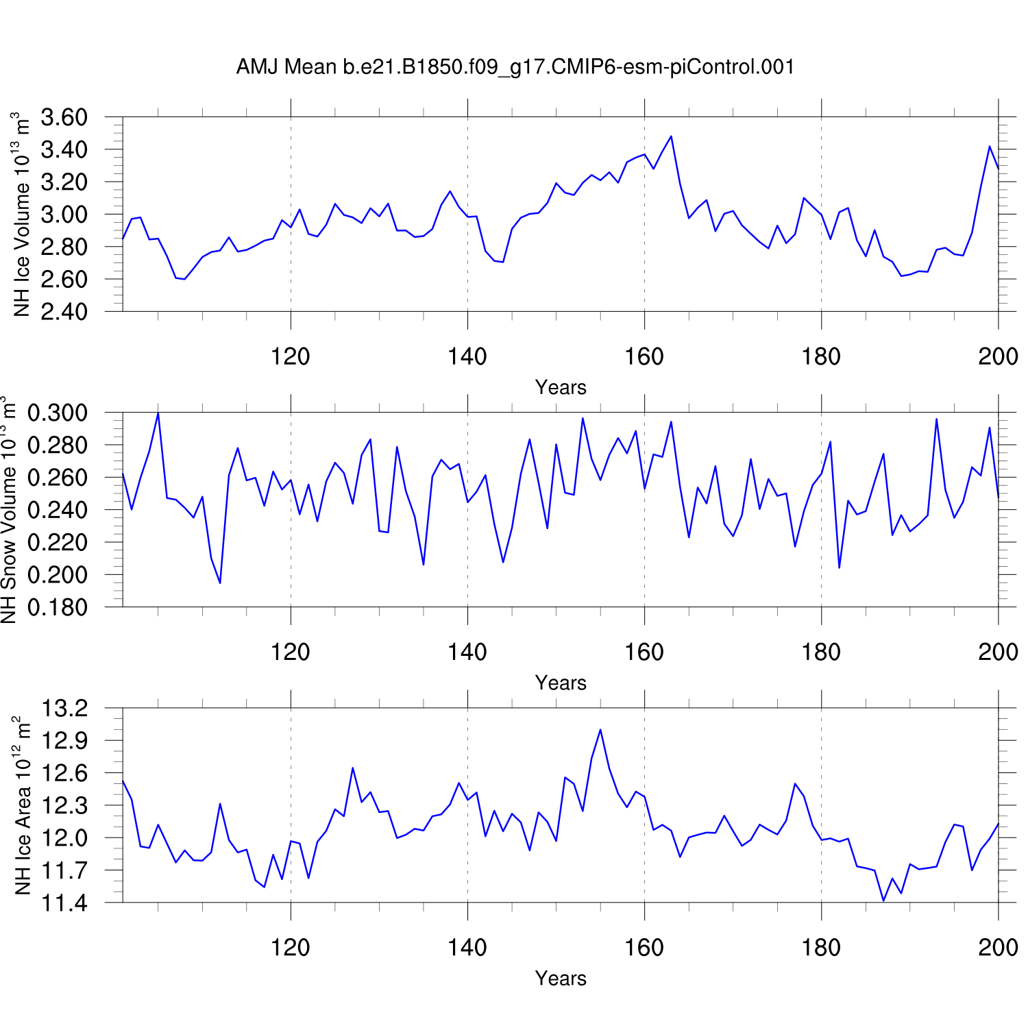 Time Series of Ice Volume, Snow Volume and Ice Area NH SH