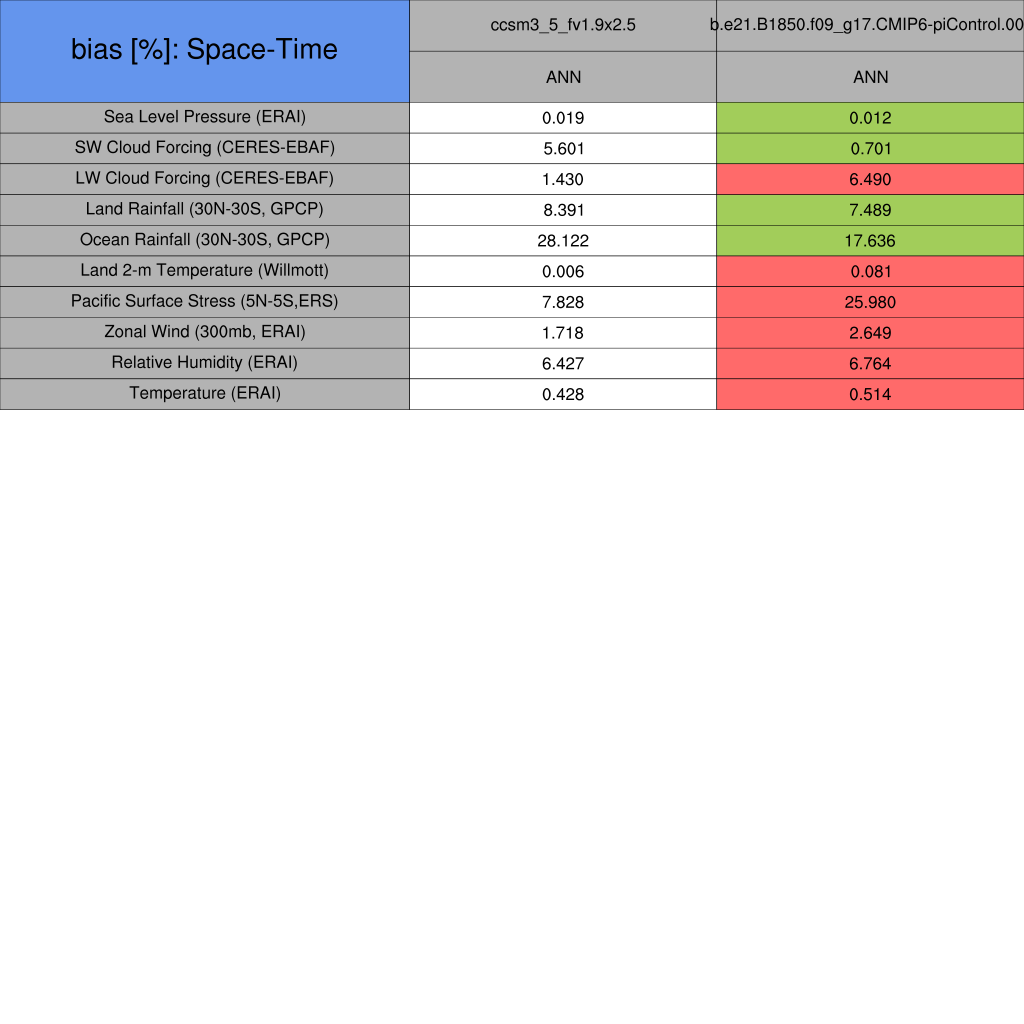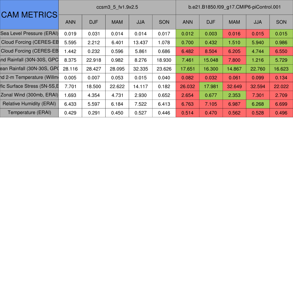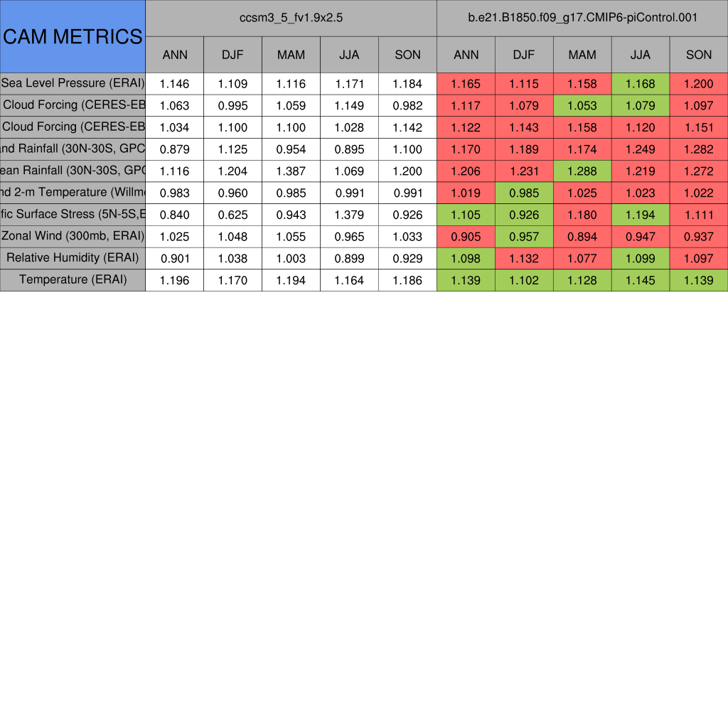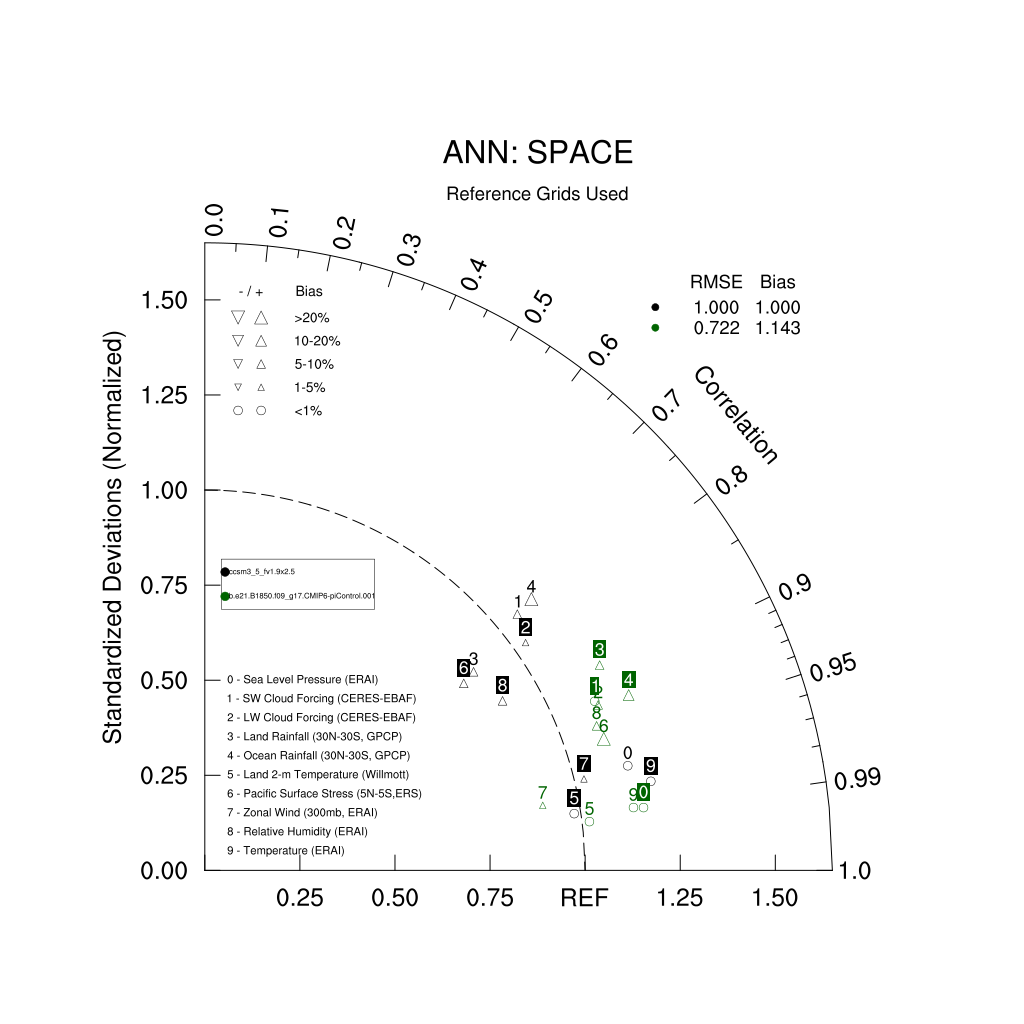 Taylor Diagrams were developed by Karl Taylor at PCMDI (paper|tech note) and aim to condense information about variance and RMSE characteristics of a particular model run when compared with observations in a single diagram. The tables summarize the individual metrics for each variable considered including: