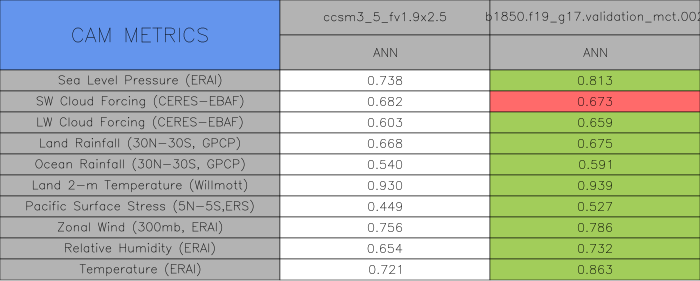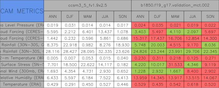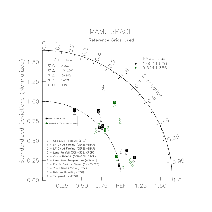 Taylor Diagrams were developed by Karl Taylor at PCMDI (paper|tech note) and aim to condense information about variance and RMSE characteristics of a particular model run when compared with observations in a single diagram. The tables summarize the individual metrics for each variable considered including: