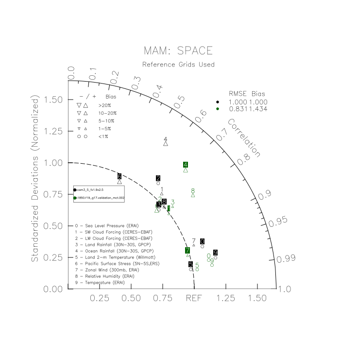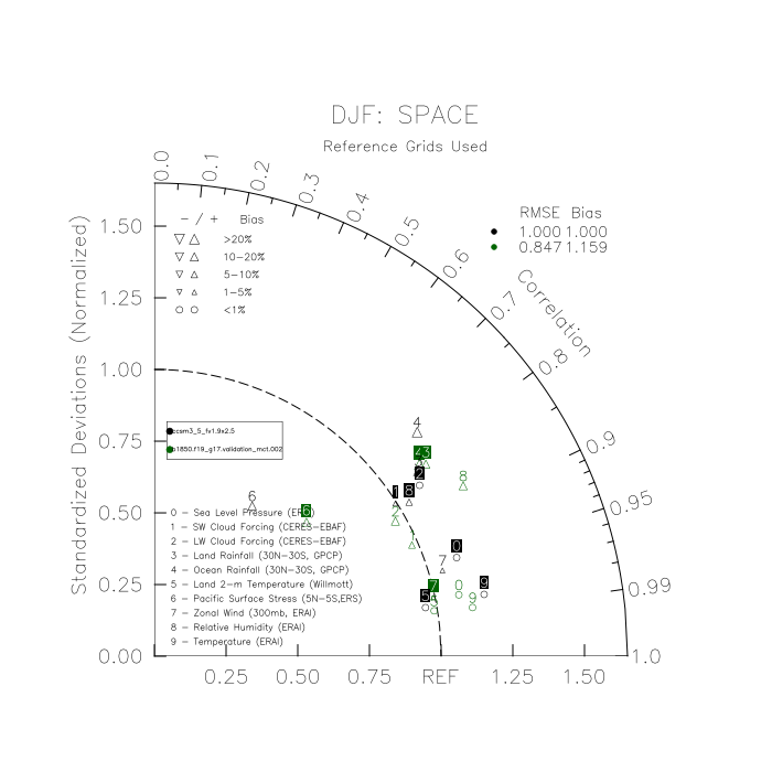 Taylor Diagrams were developed by Karl Taylor at PCMDI (paper|tech note) and aim to condense information about variance and RMSE characteristics of a particular model run when compared with observations in a single diagram. The tables summarize the individual metrics for each variable considered including: