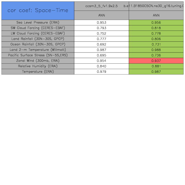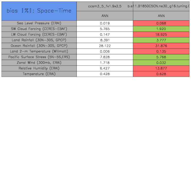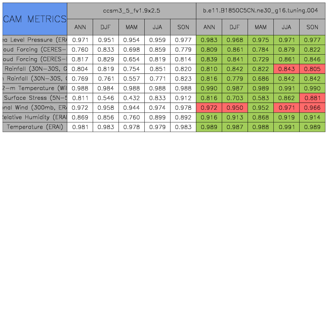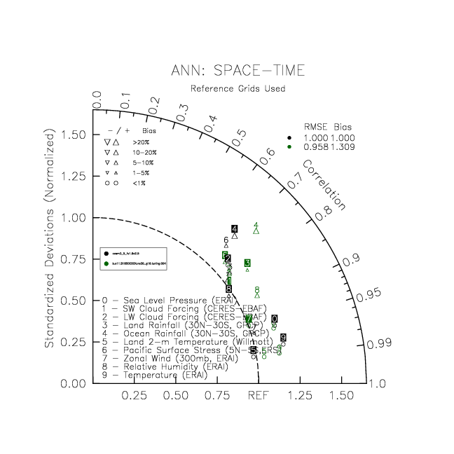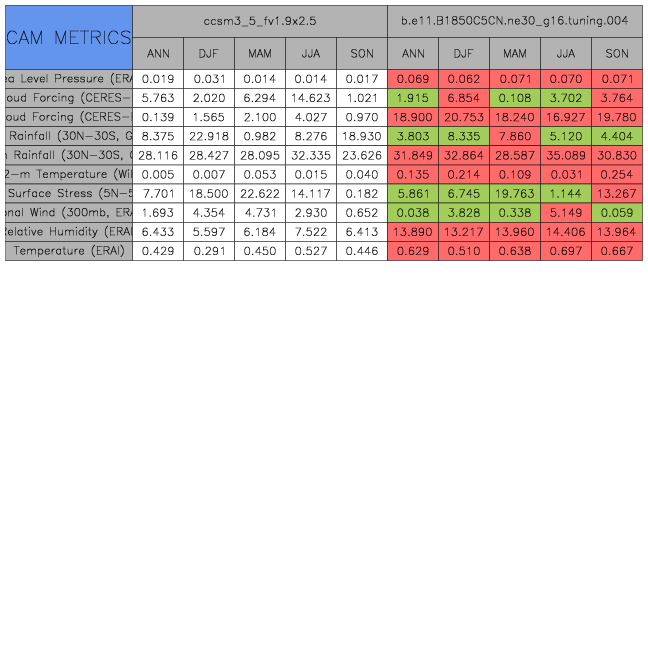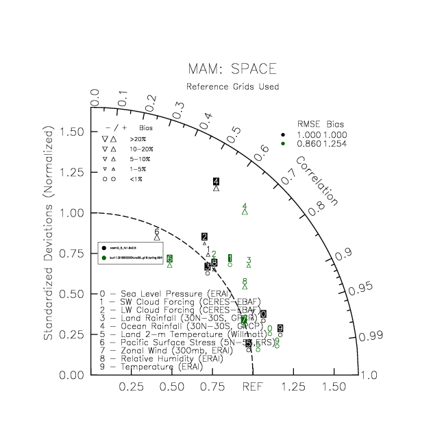 Taylor Diagrams were developed by Karl Taylor at PCMDI (paper|tech note) and aim to condense information about variance and RMSE characteristics of a particular model run when compared with observations in a single diagram. The tables summarize the individual metrics for each variable considered including: