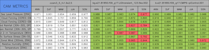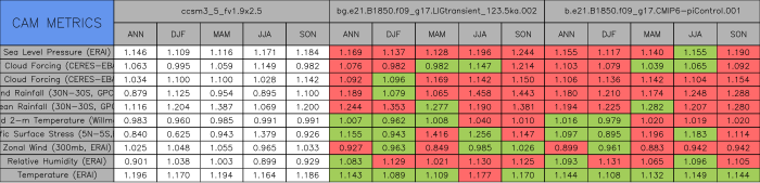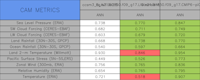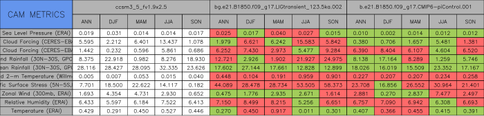 Taylor Diagrams were developed by Karl Taylor at PCMDI (paper|tech note) and aim to condense information about variance and RMSE characteristics of a particular model run when compared with observations in a single diagram. The tables summarize the individual metrics for each variable considered including: