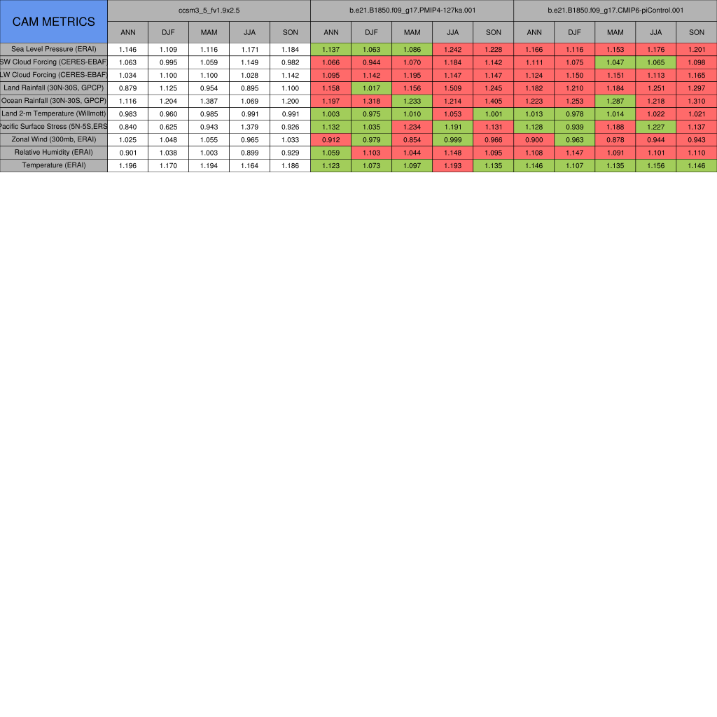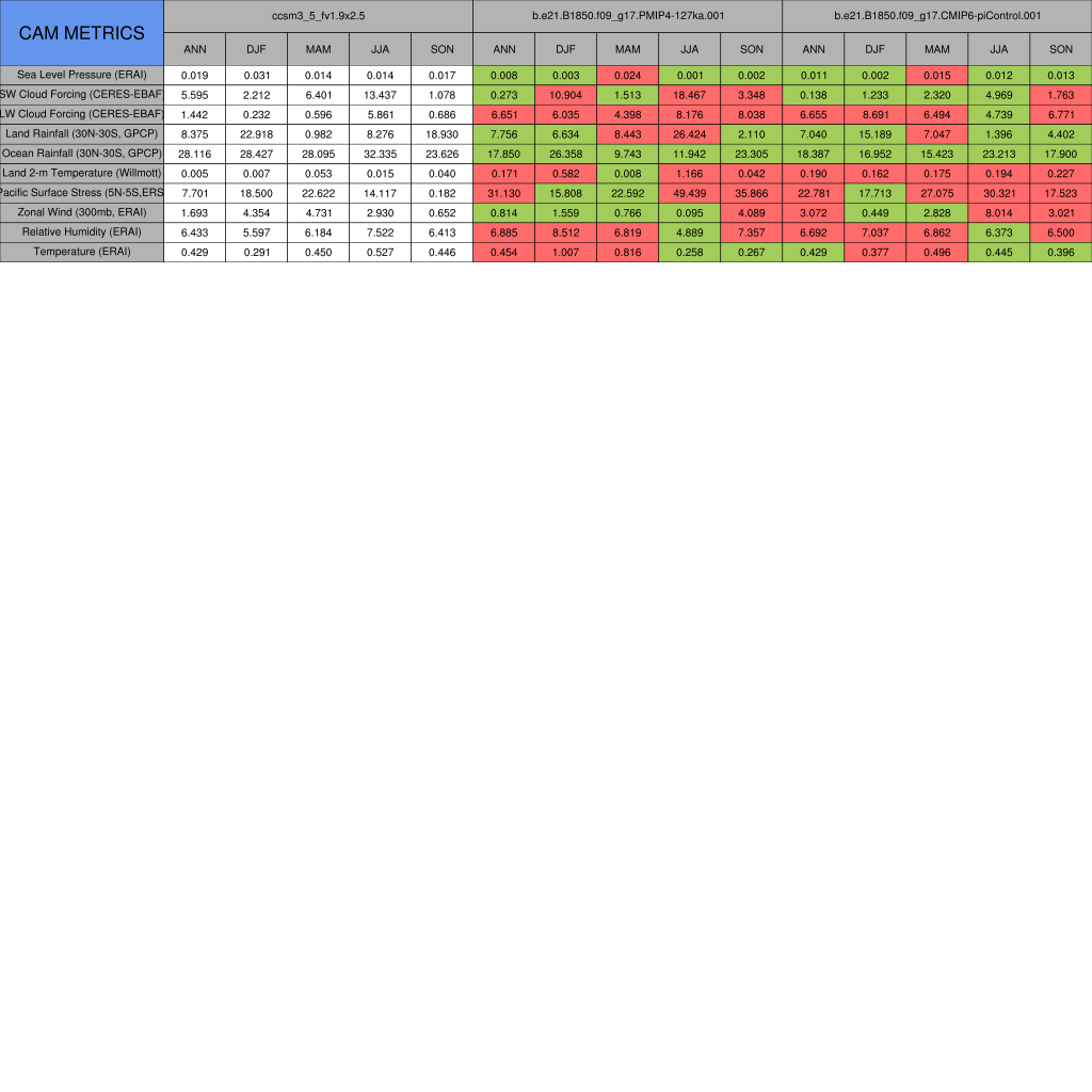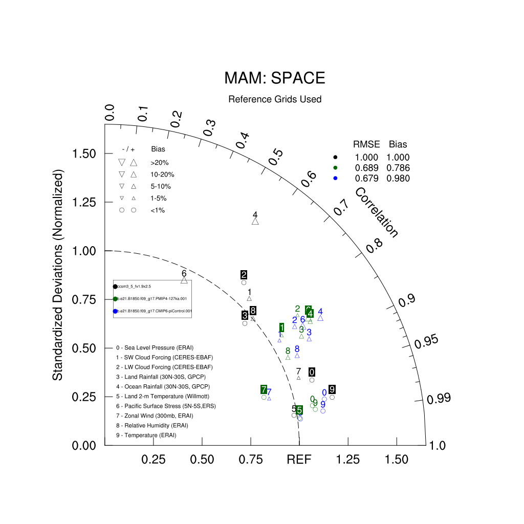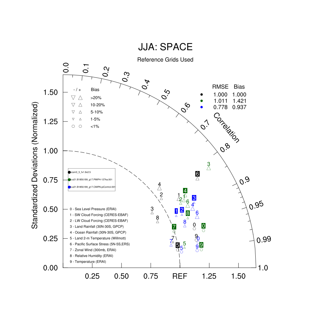 Taylor Diagrams were developed by Karl Taylor at PCMDI (paper|tech note) and aim to condense information about variance and RMSE characteristics of a particular model run when compared with observations in a single diagram. The tables summarize the individual metrics for each variable considered including: