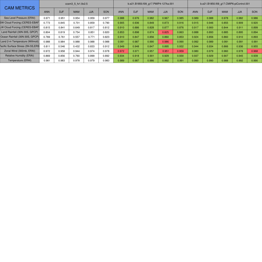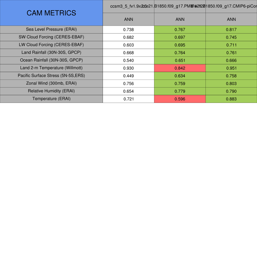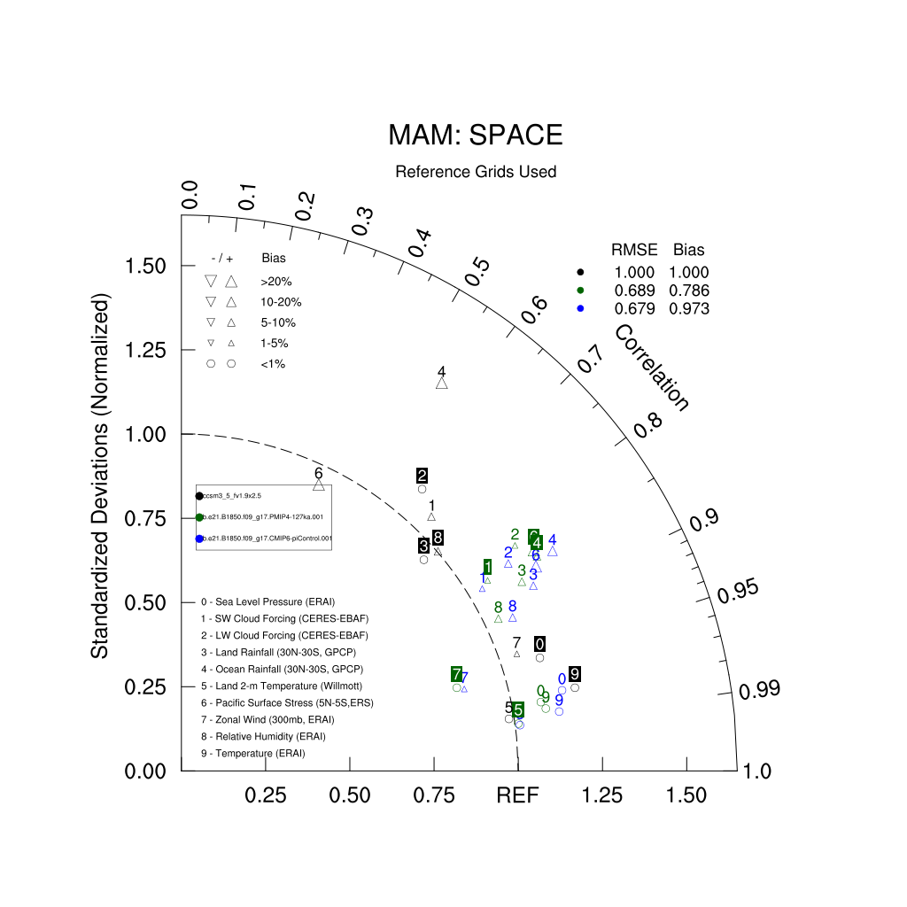 Taylor Diagrams were developed by Karl Taylor at PCMDI (paper|tech note) and aim to condense information about variance and RMSE characteristics of a particular model run when compared with observations in a single diagram. The tables summarize the individual metrics for each variable considered including: