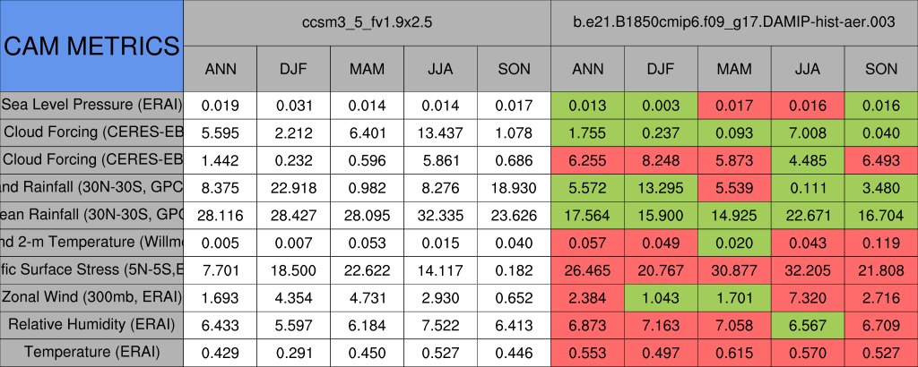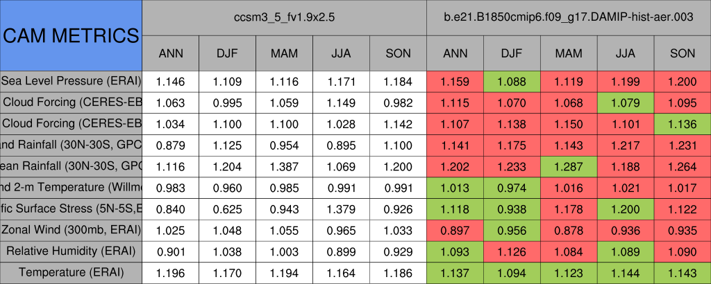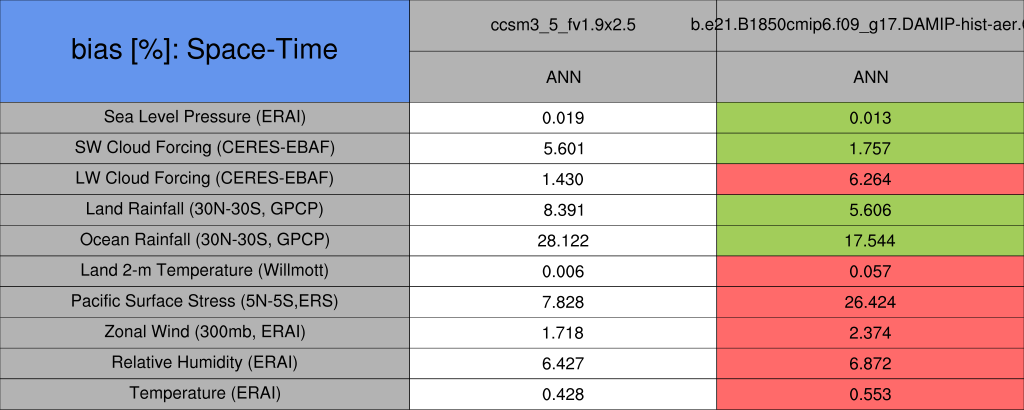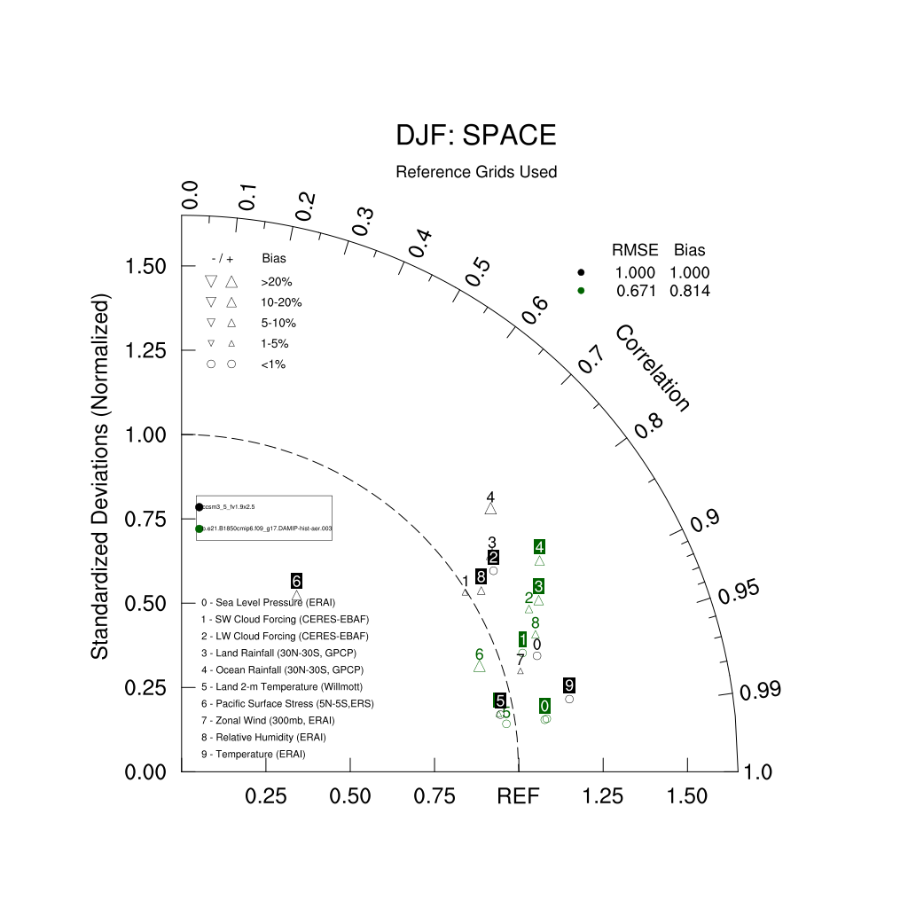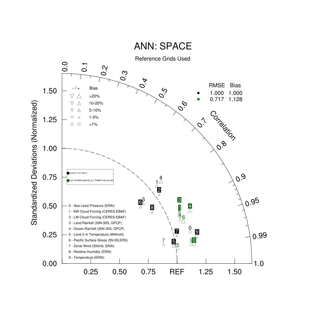 Taylor Diagrams were developed by Karl Taylor at PCMDI (paper|tech note) and aim to condense information about variance and RMSE characteristics of a particular model run when compared with observations in a single diagram. The tables summarize the individual metrics for each variable considered including: