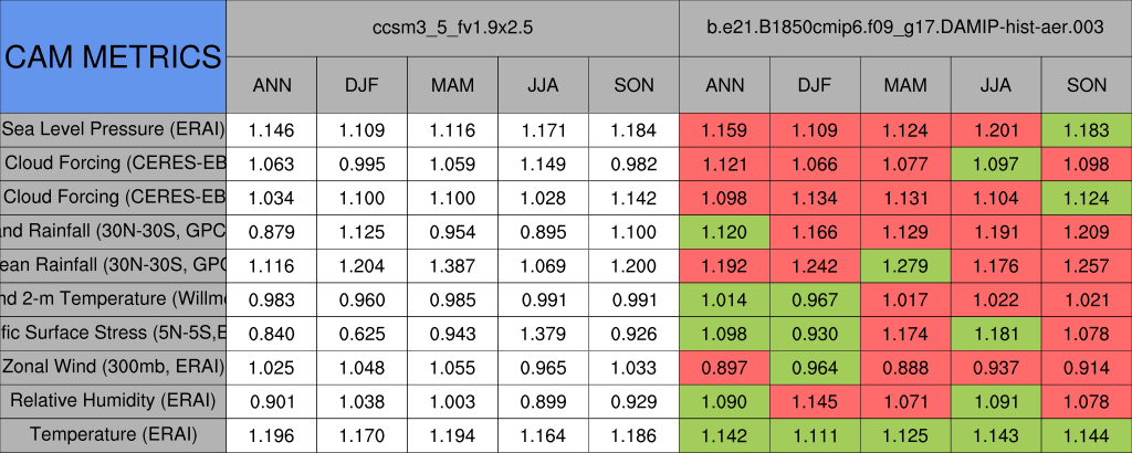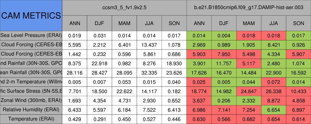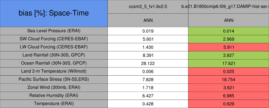 Taylor Diagrams were developed by Karl Taylor at PCMDI (paper|tech note) and aim to condense information about variance and RMSE characteristics of a particular model run when compared with observations in a single diagram. The tables summarize the individual metrics for each variable considered including: