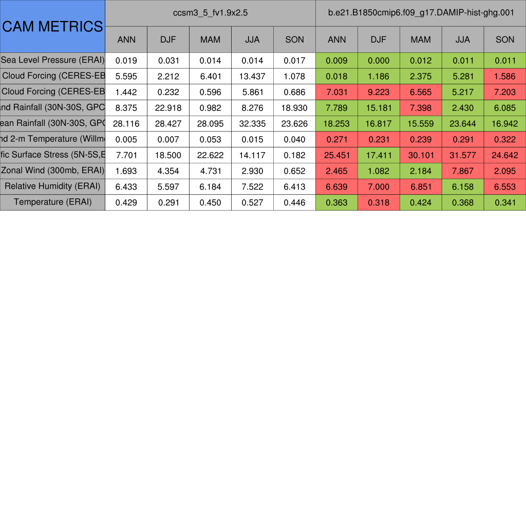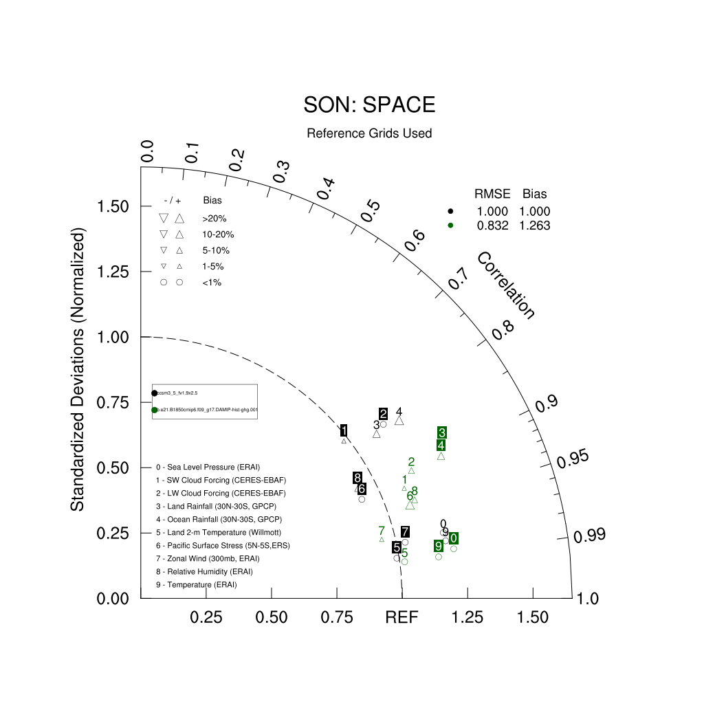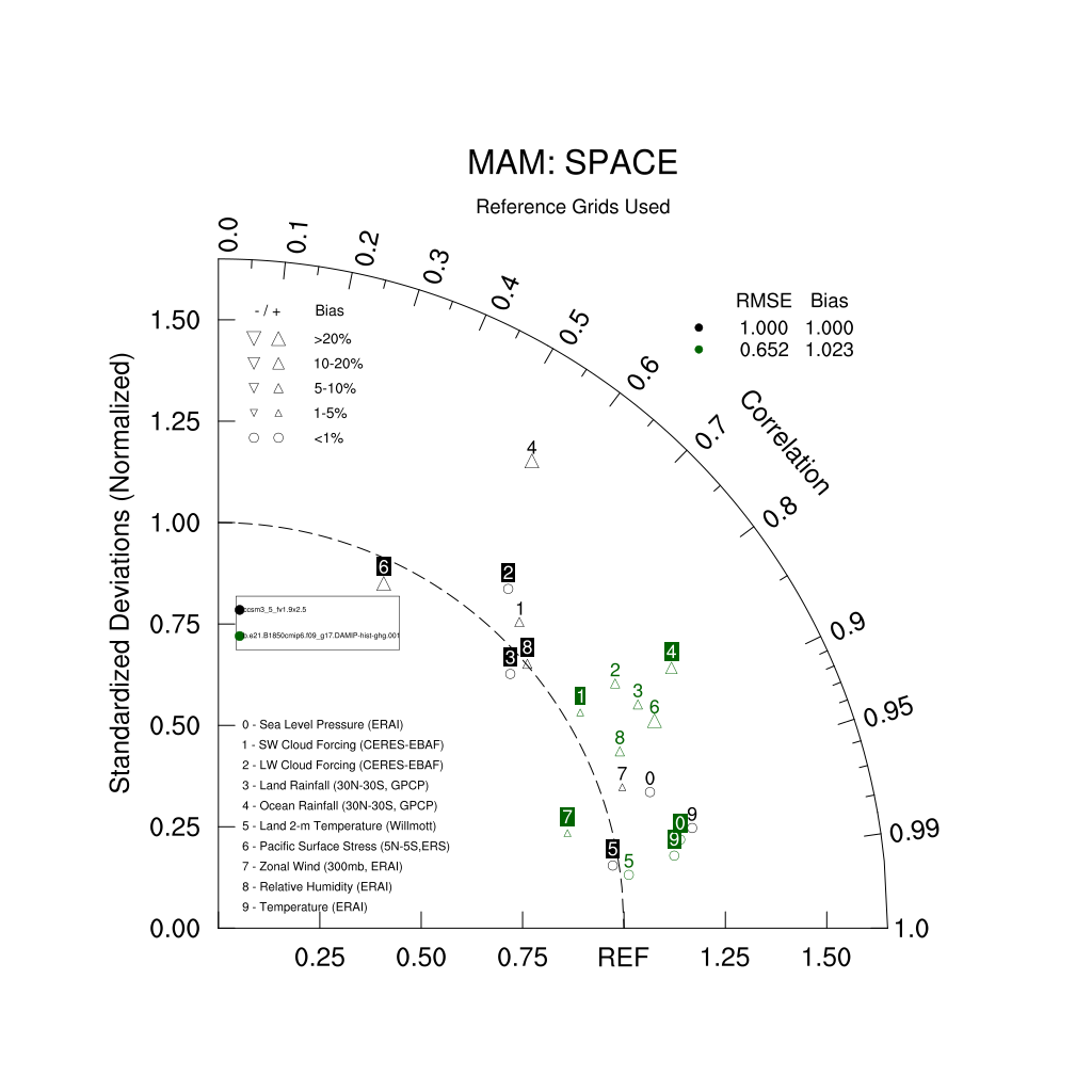 Taylor Diagrams were developed by Karl Taylor at PCMDI (paper|tech note) and aim to condense information about variance and RMSE characteristics of a particular model run when compared with observations in a single diagram. The tables summarize the individual metrics for each variable considered including:
