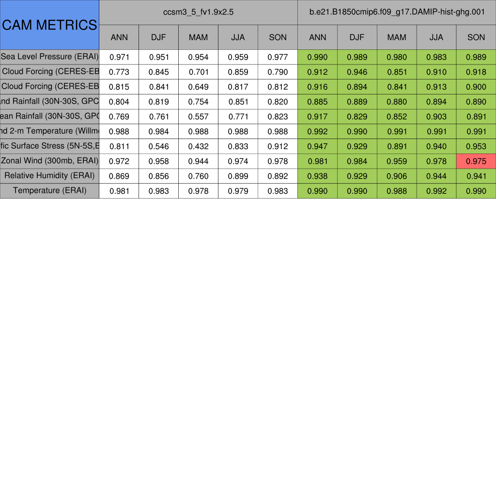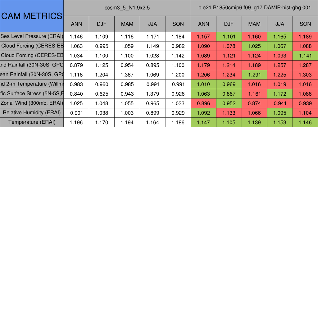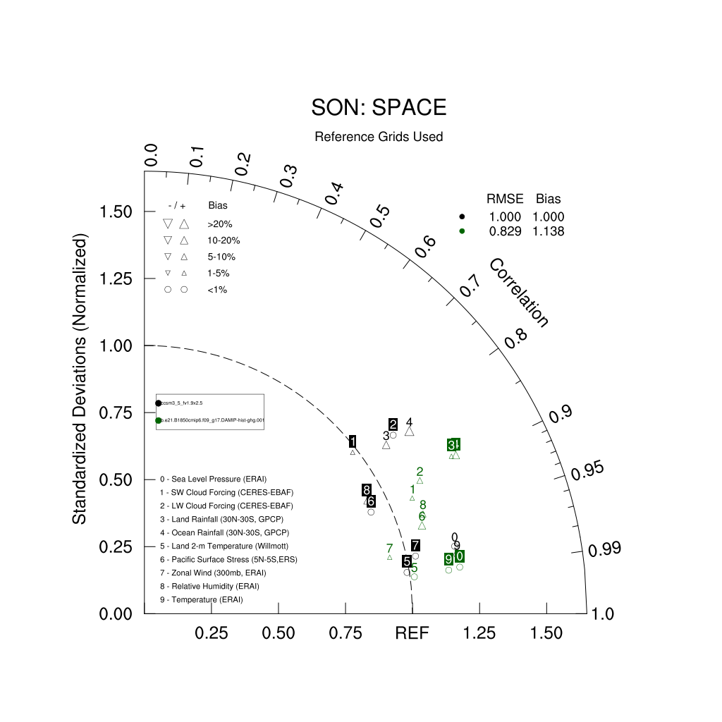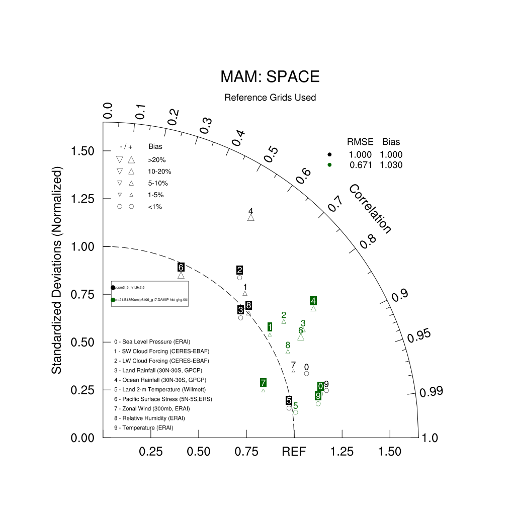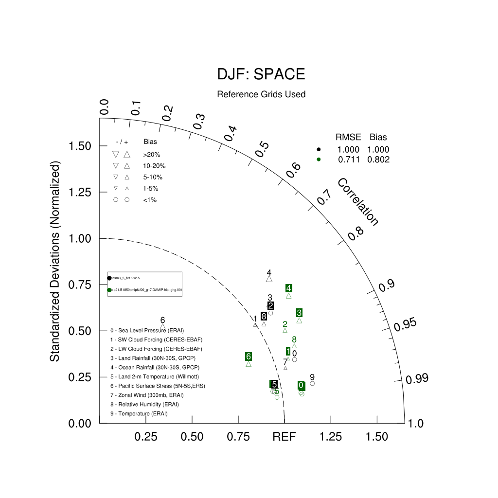 Taylor Diagrams were developed by Karl Taylor at PCMDI (paper|tech note) and aim to condense information about variance and RMSE characteristics of a particular model run when compared with observations in a single diagram. The tables summarize the individual metrics for each variable considered including: