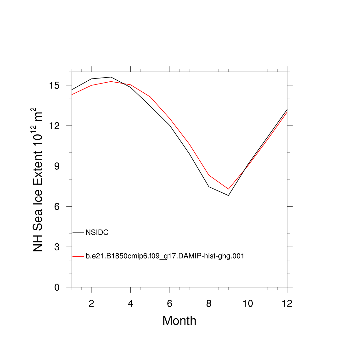 Climatological Monthly Mean Extent vs Obs plot plot