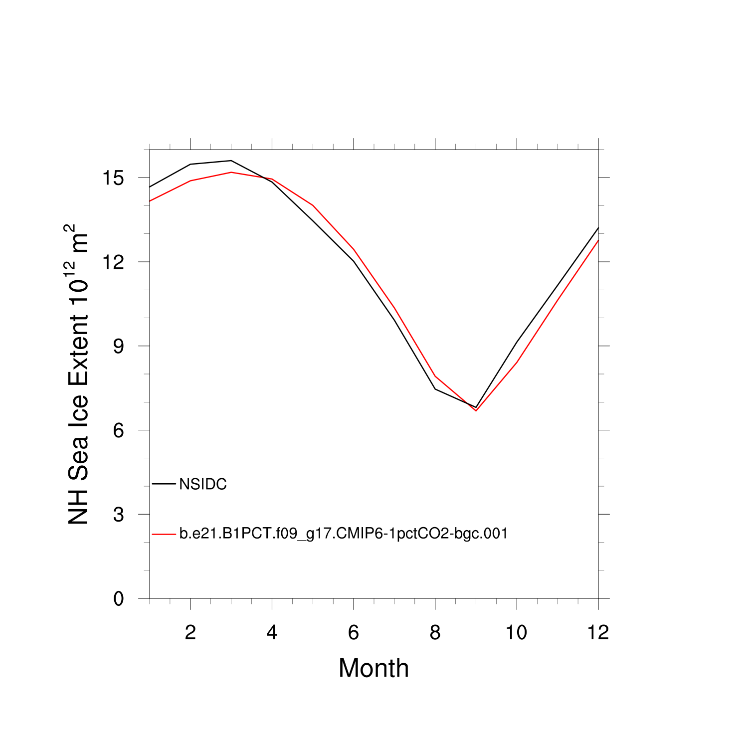 Climatological Monthly Mean Extent vs Obs plot plot
