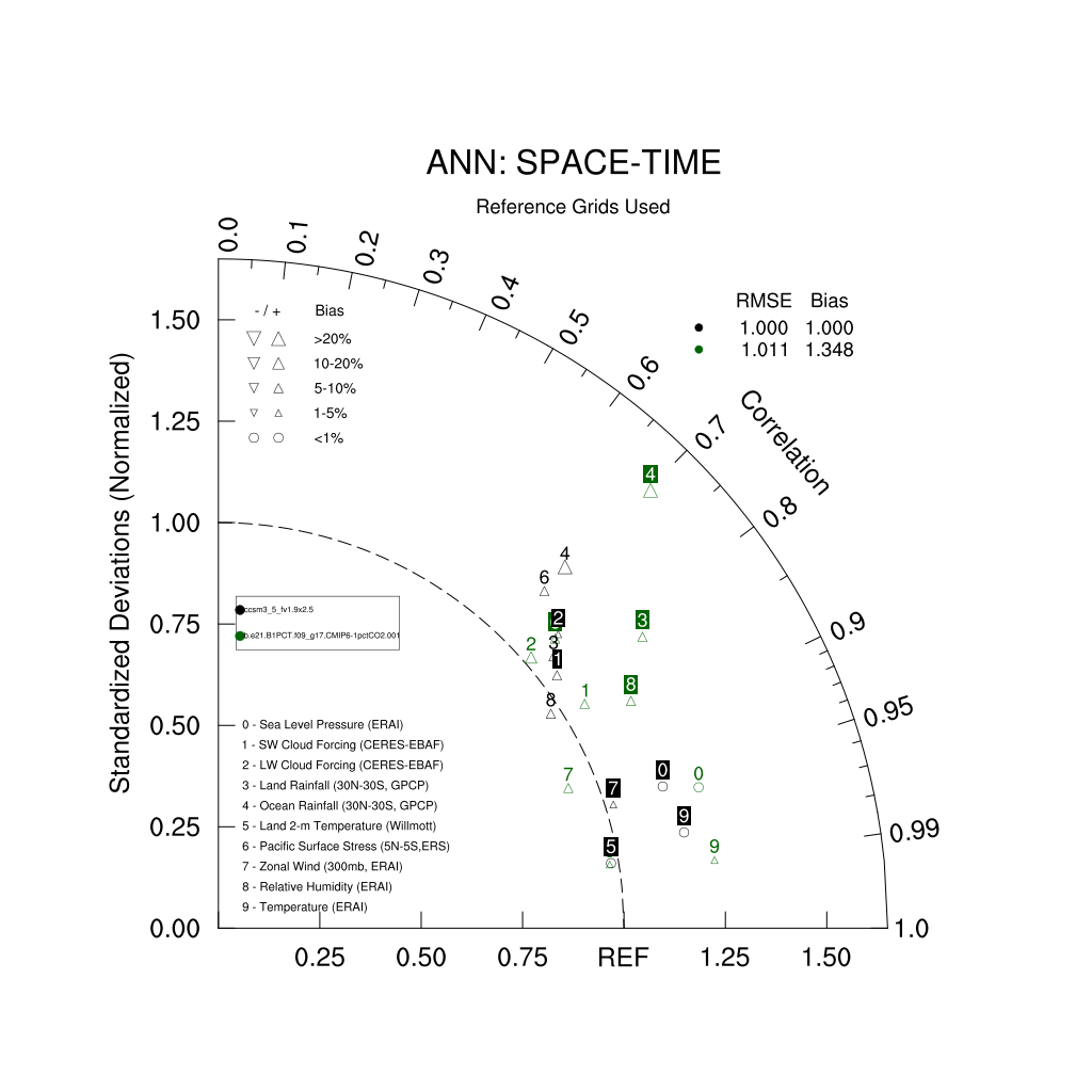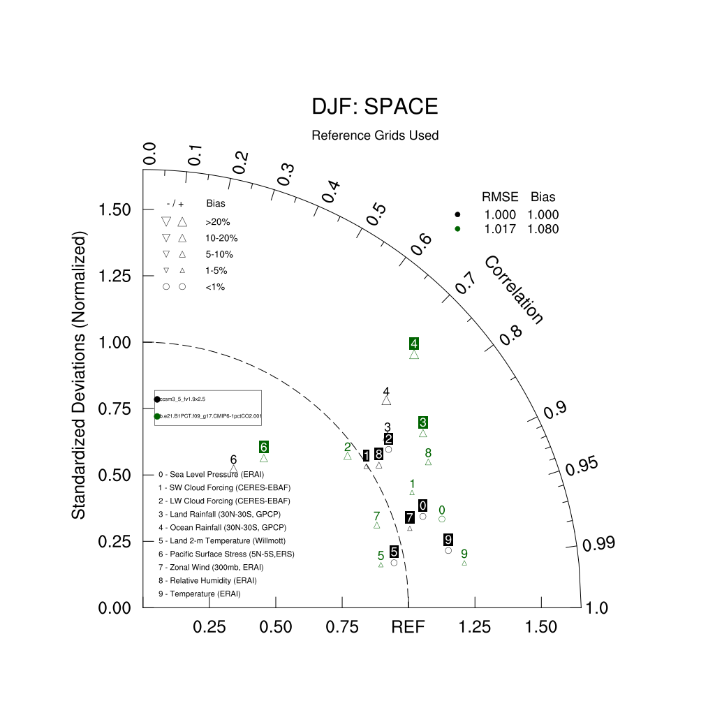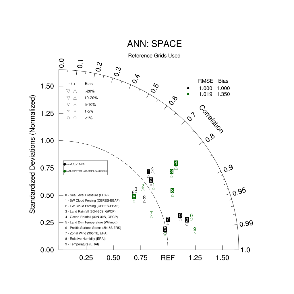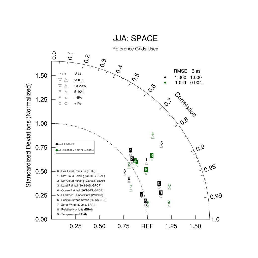 Taylor Diagrams were developed by Karl Taylor at PCMDI (paper|tech note) and aim to condense information about variance and RMSE characteristics of a particular model run when compared with observations in a single diagram. The tables summarize the individual metrics for each variable considered including:
