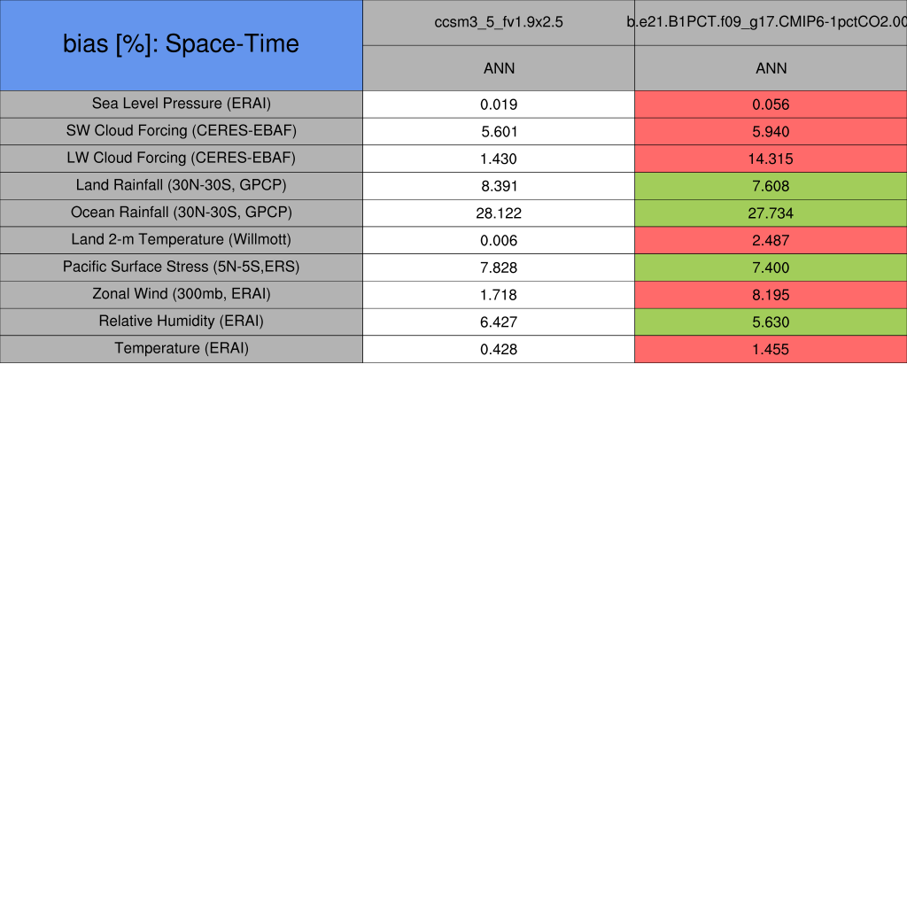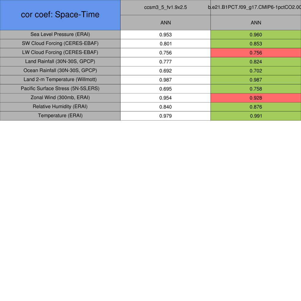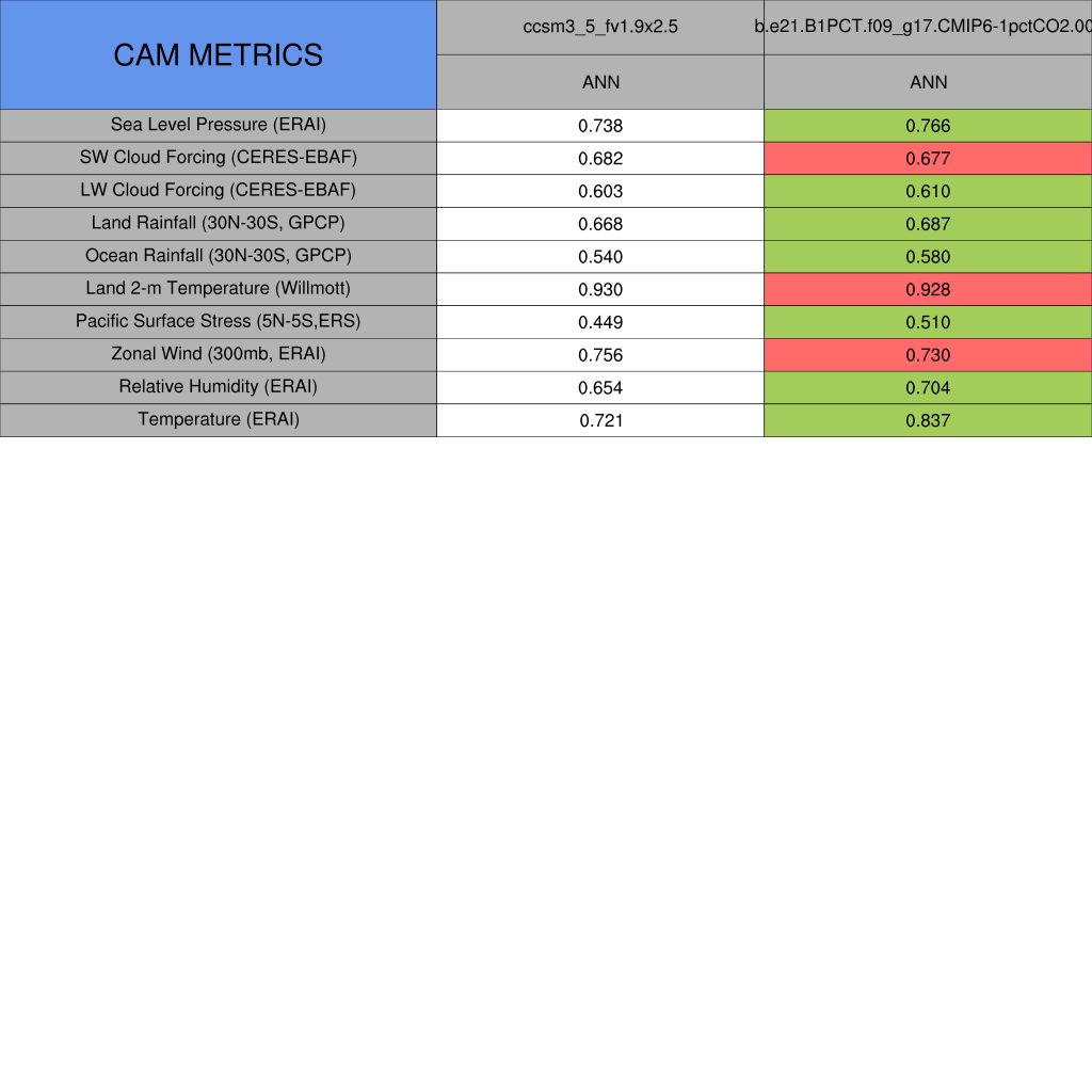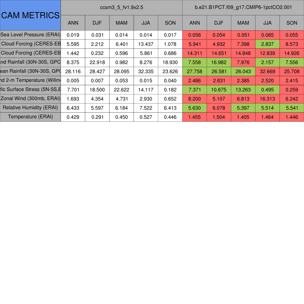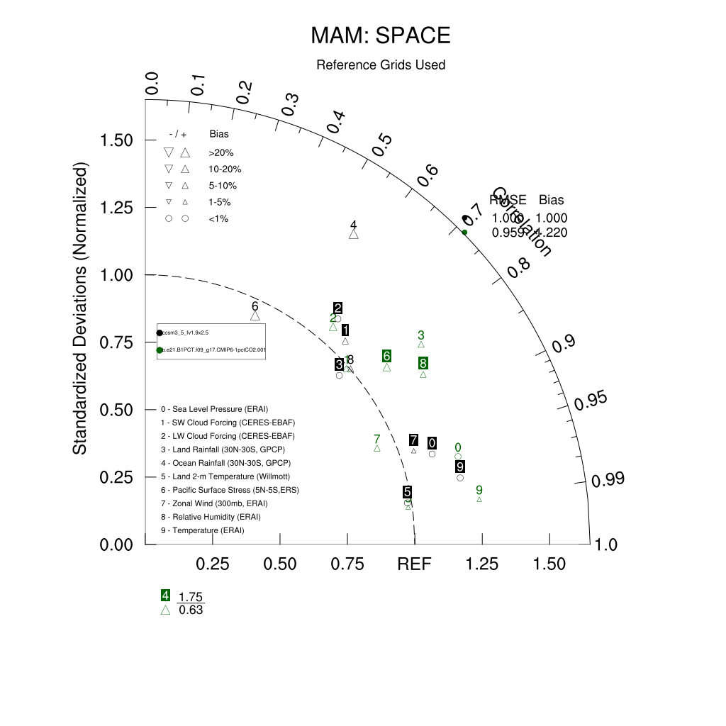 Taylor Diagrams were developed by Karl Taylor at PCMDI (paper|tech note) and aim to condense information about variance and RMSE characteristics of a particular model run when compared with observations in a single diagram. The tables summarize the individual metrics for each variable considered including: